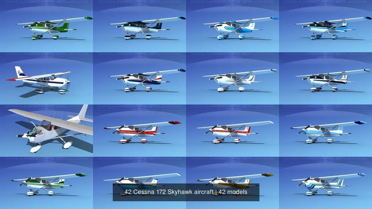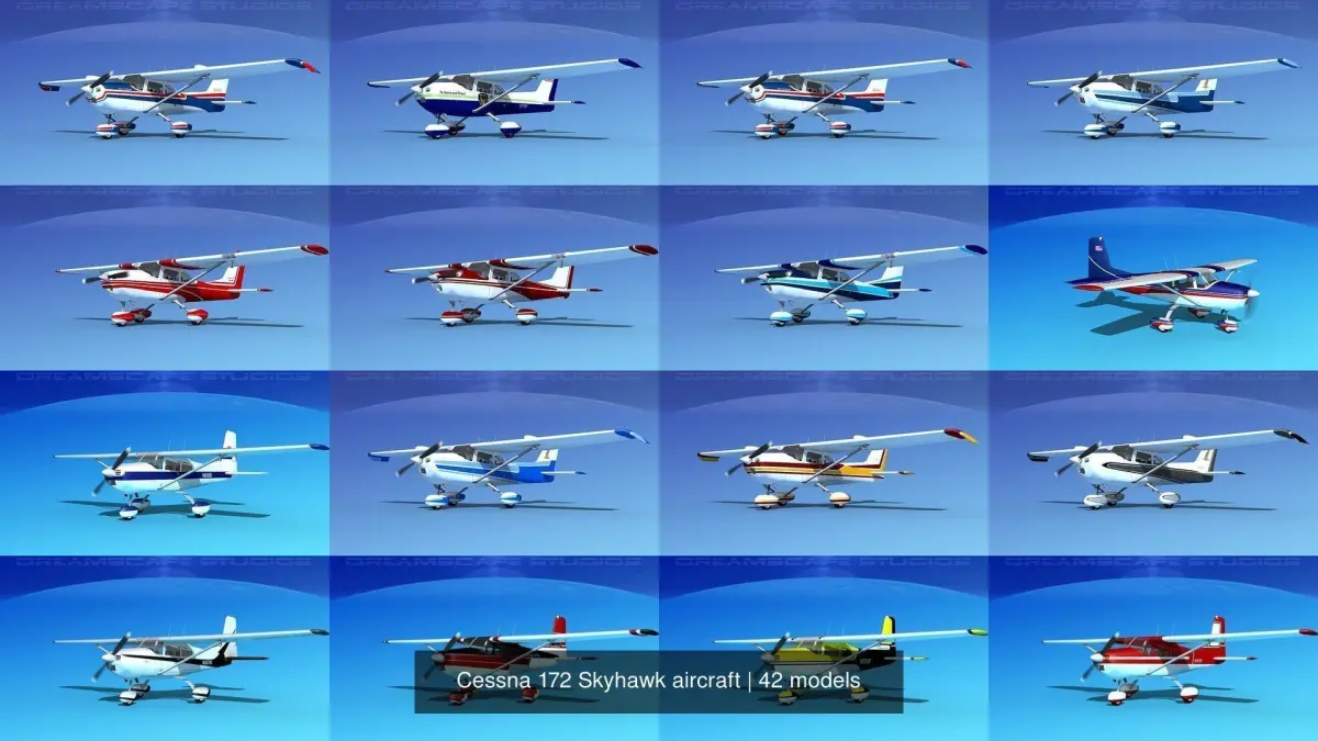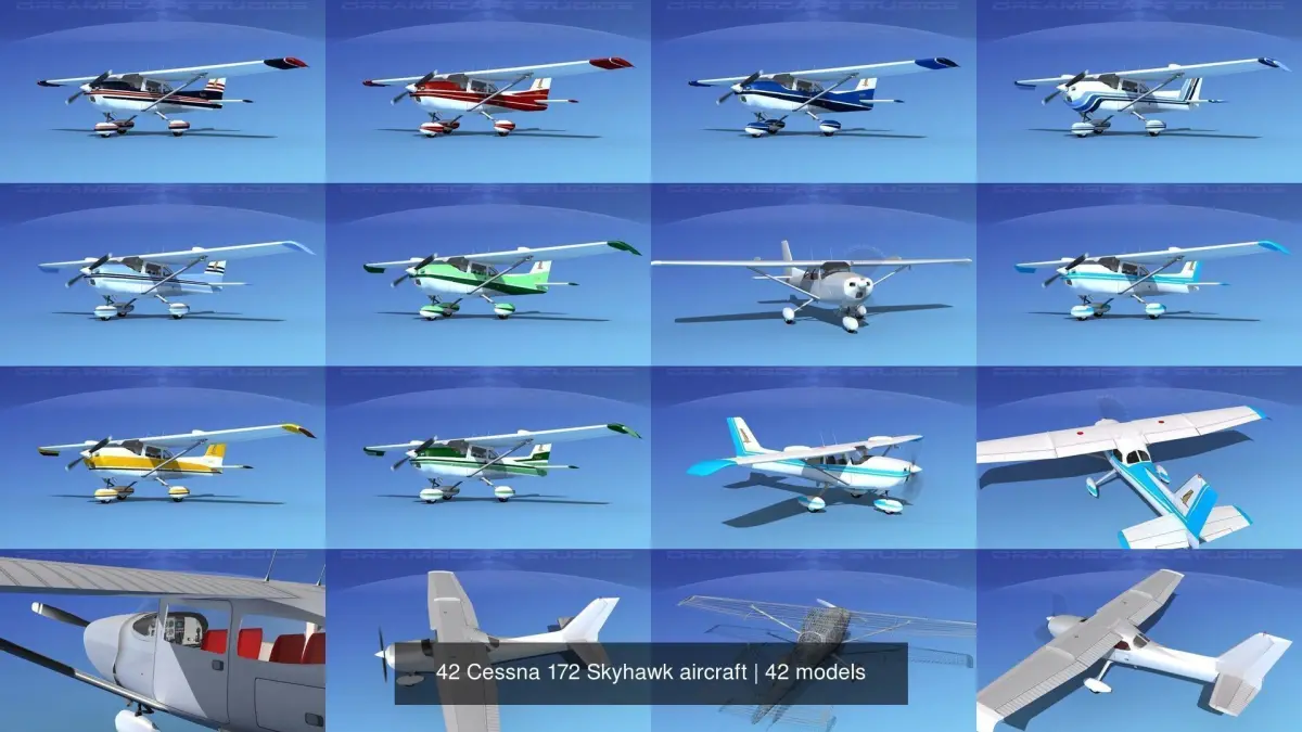 A large collection of 42 Cessna 172 Skyhawk 3D models. Models are built near to scale within a couple of percent of the actual dimensions of the aircraft. These models include many animateable features including ailerons, flaps, elevators, rudder, retractable landing gear and nose gear doors. Propellers are animated. The engine, engine mount exhaust and intake systems are modeled. The cowling can be removed to show the engine and propeller at a moderate distance. This model is fairly detailed and includes the ELT antenna and pitot tube as well as some interior cabin features and controls. Included are the yokes, throttle and engine controls, new instrument panel and seating. Native format is 3ds Max. Models are exported to a wide variety of formats. Exported formats (3ds, lwo and obj) are prepared well to work correctly with every standard modeling software. Compatibility level with other software’s may be limited. Models are textured with multiple large HD maps and provide a good realistic rendering when lighted and animated properly. Models are developed for animation and rendering in-flight. These may be used for other purposes such as a static model to populate an airport scene. Previews were rendered using 3dsmax standard scanline.