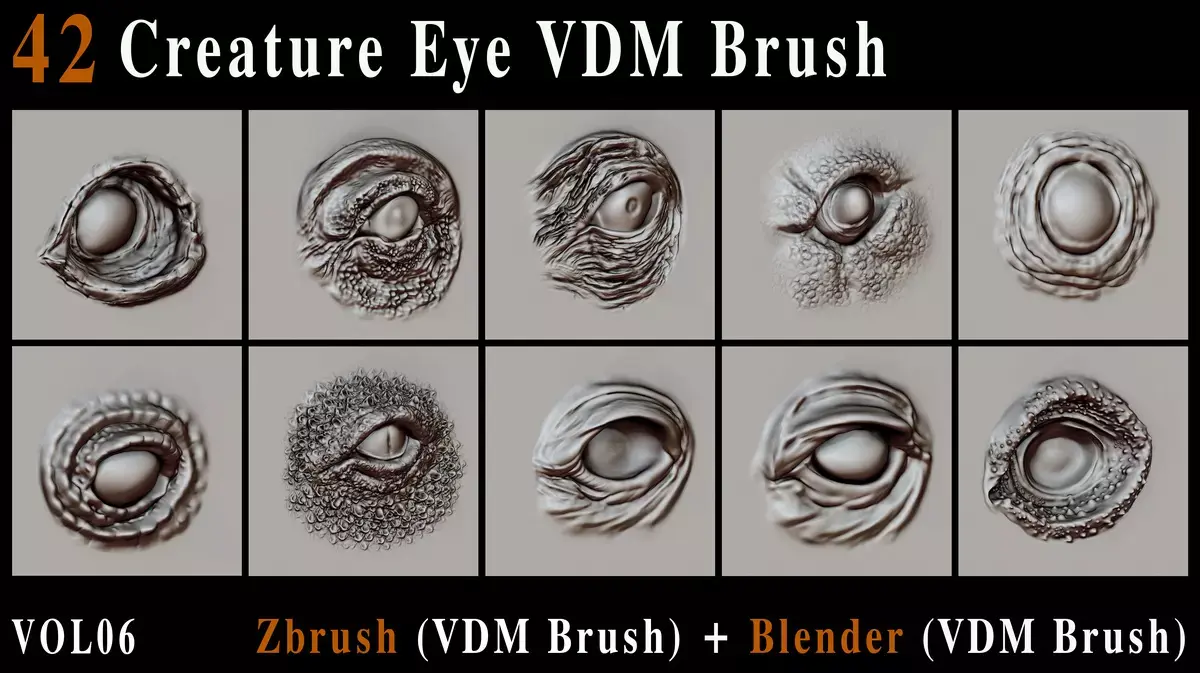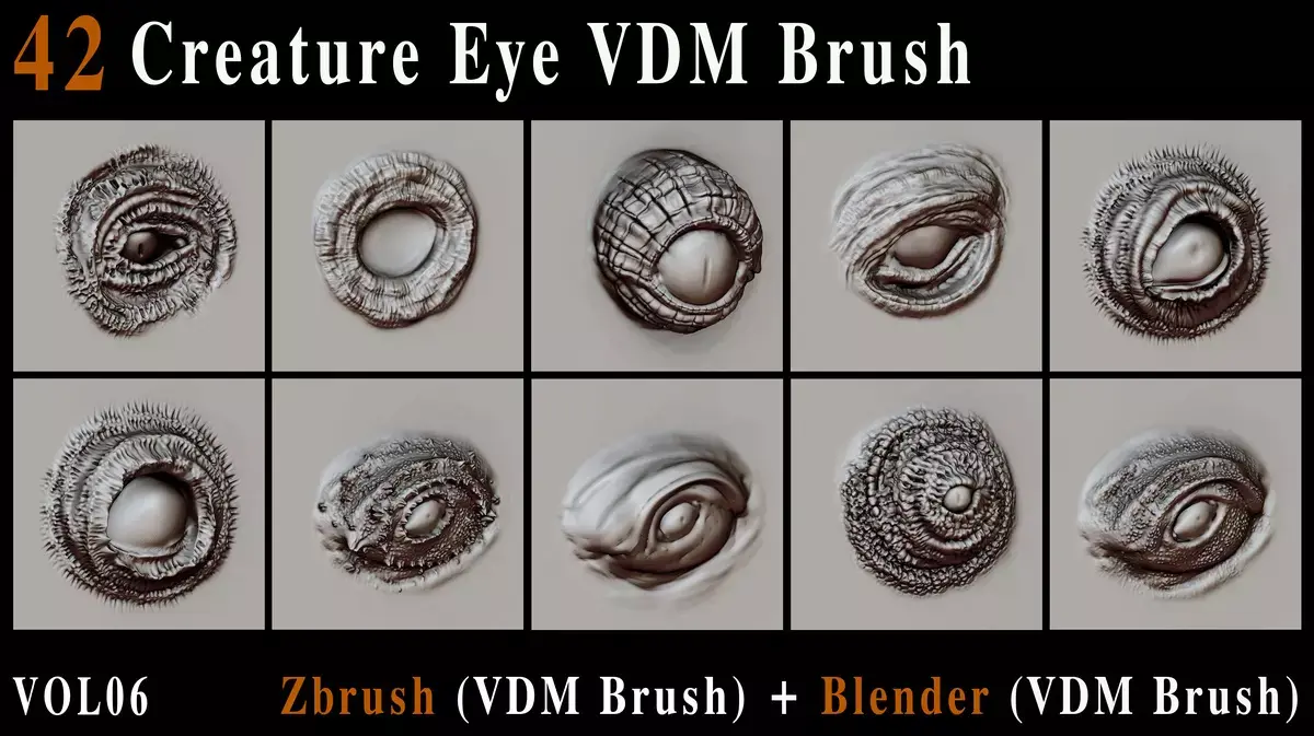 Enhance your creature designs with this collection of 42 high-quality creature eye VDM brushes, designed for use in both ZBrush and Blender. Effortlessly add realistic, detailed eye sculpts to your characters and creatures. This product is perfect for artists looking to streamline their creature design process with professional-grade eye details.Package Includes: 42 ZBrush VDM Brushes (.zbp)•