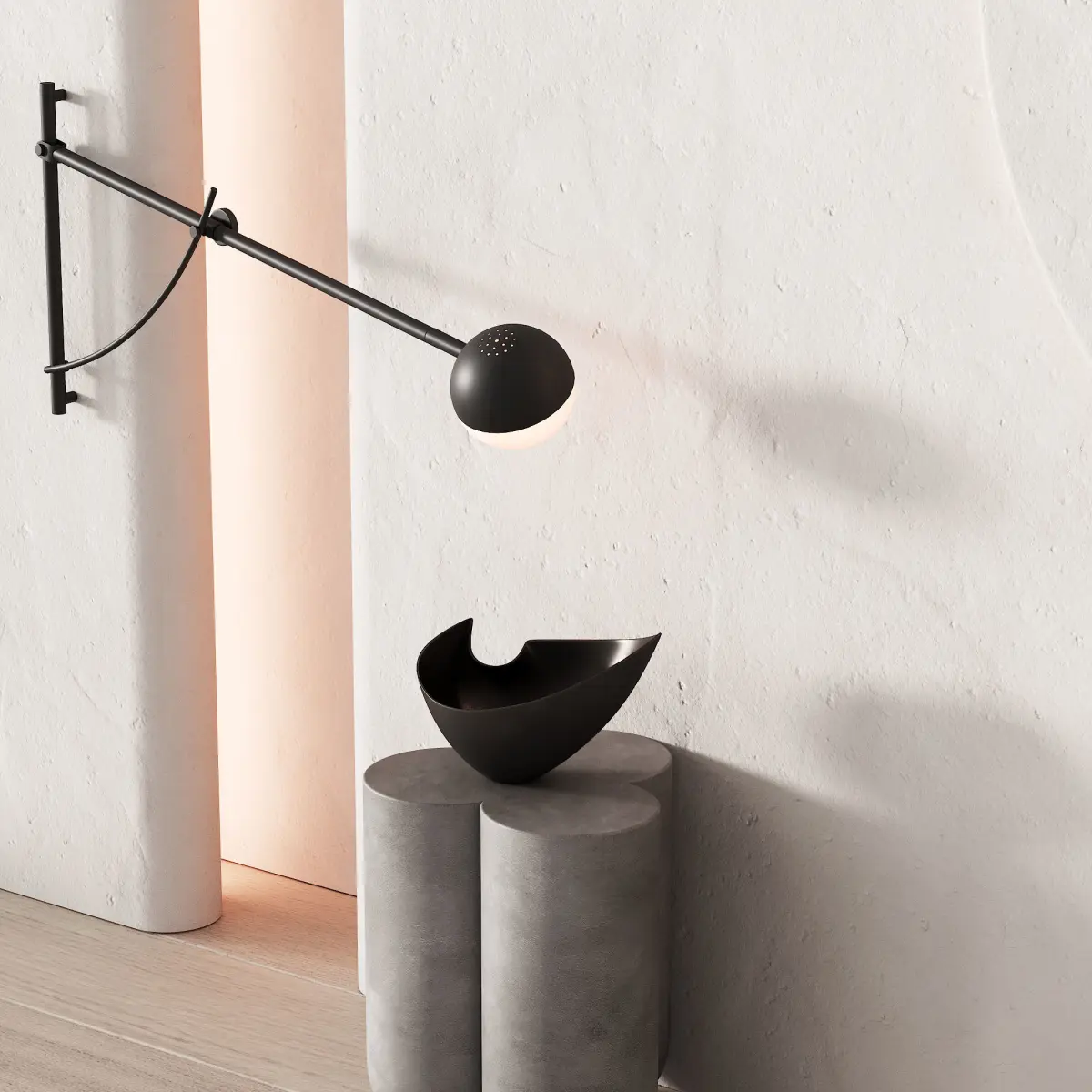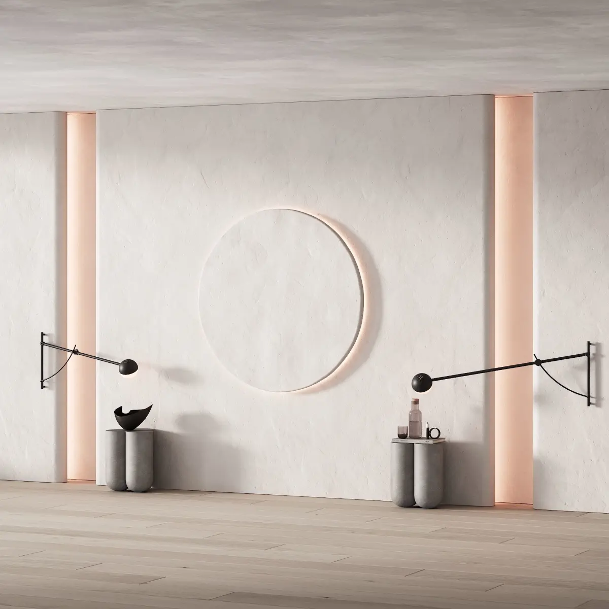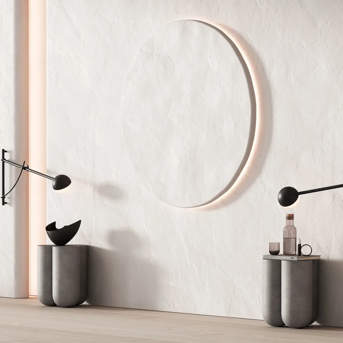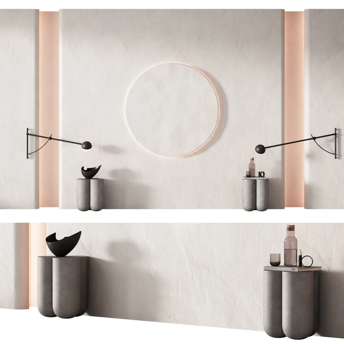 The model also contains decor and filling: water bottle FUUM Water Carafe and Glass by blomus, glass, vase, wall lamp / sconce Northern Balancer wall lamp, book, candlestick and candle Menu Balance Candle Holder, bedside / coffee table 197 moor Large side table by Lisa Allegra, round wall panel with LED lighting