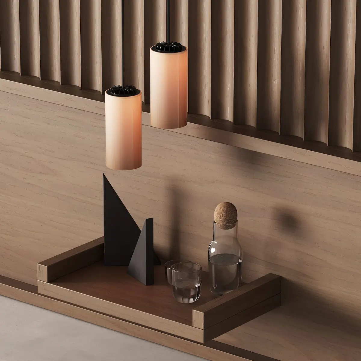 The model also has decor and filling: Muuto Corky Carafe water bottle, glass, stone vase, handmade stone, Santa & Cole Cirio Simple by Antoni Arola pendant lamp, books, round wooden wall panel, bookends