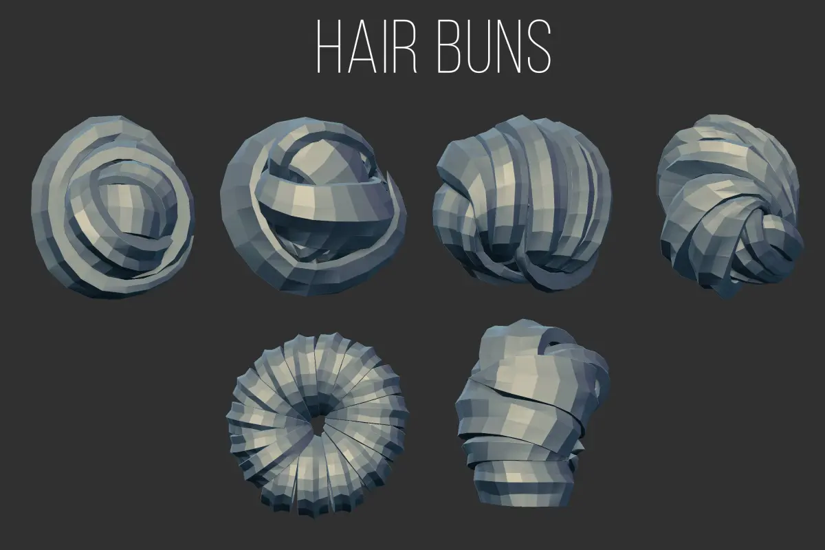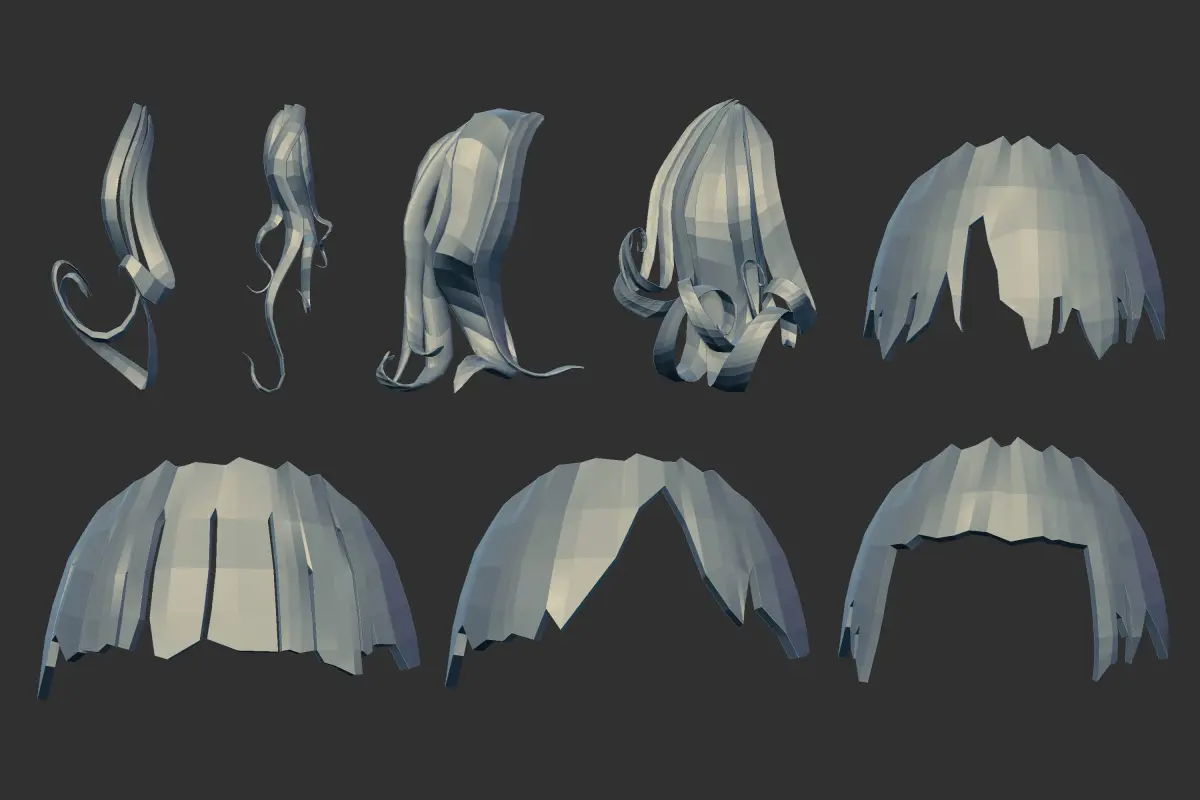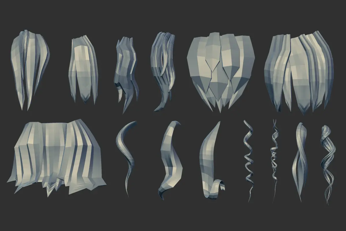 45 Female cartoon character hair strand and parts low poly IMM brush set for Zbrush, fbx and obj files.