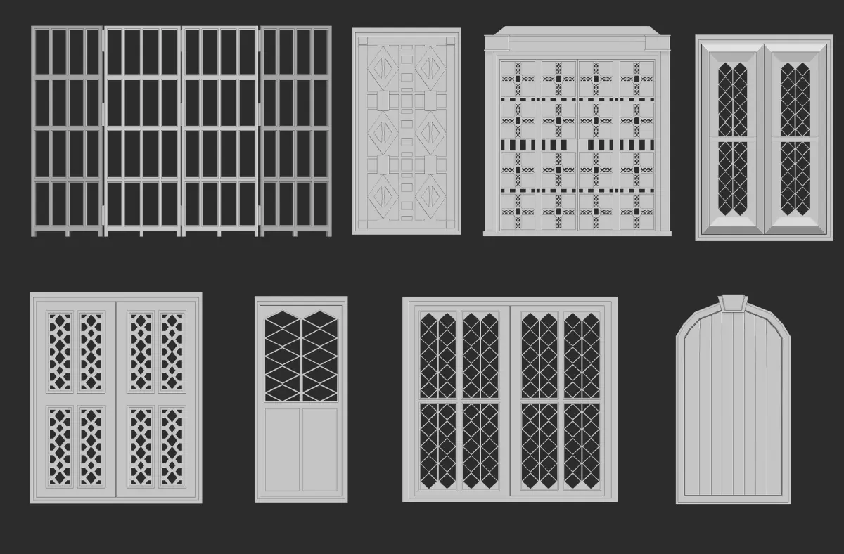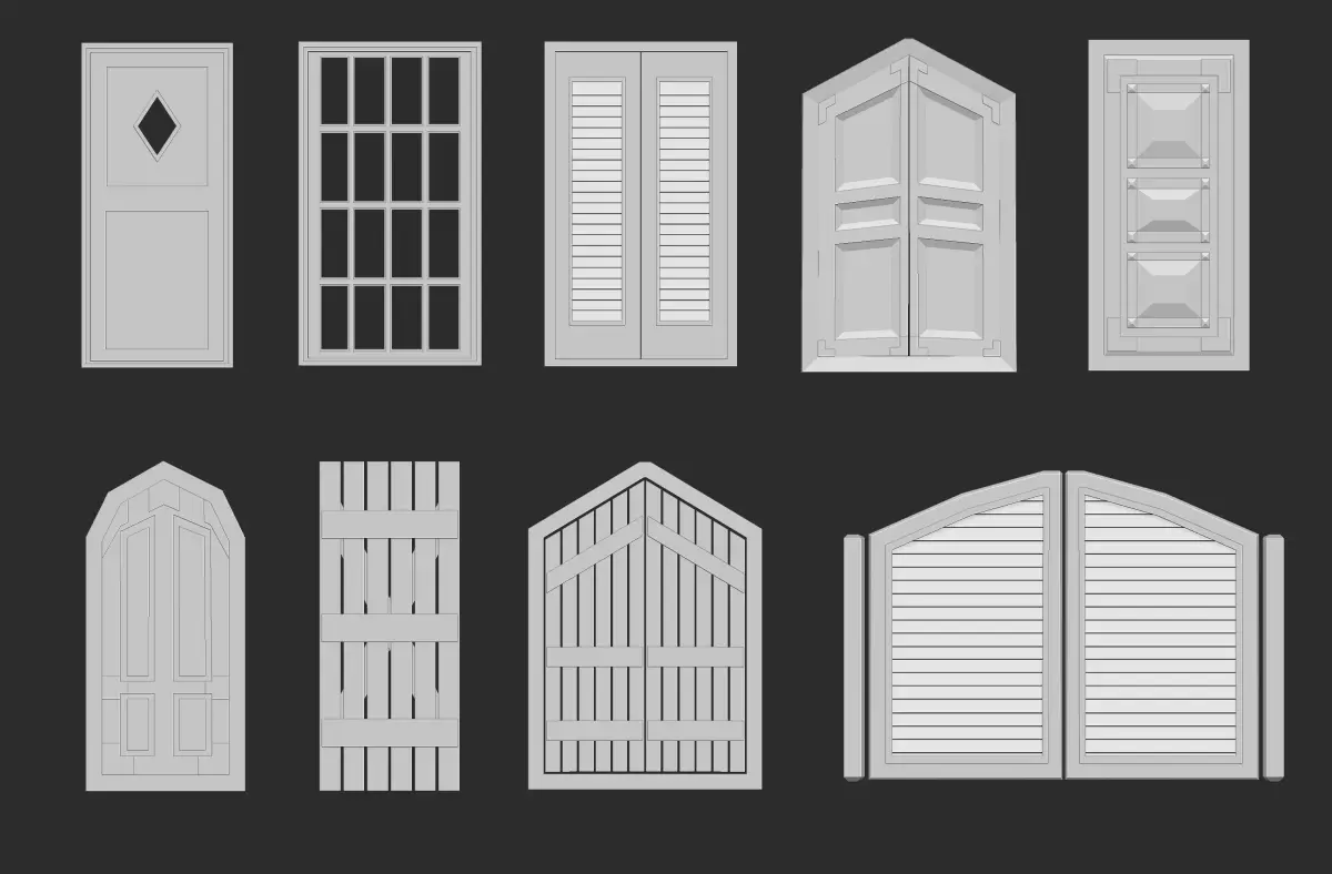45 low poly interior and exterior door base mesh shapes IMM brush set for Zbrush, obj and fbx files.