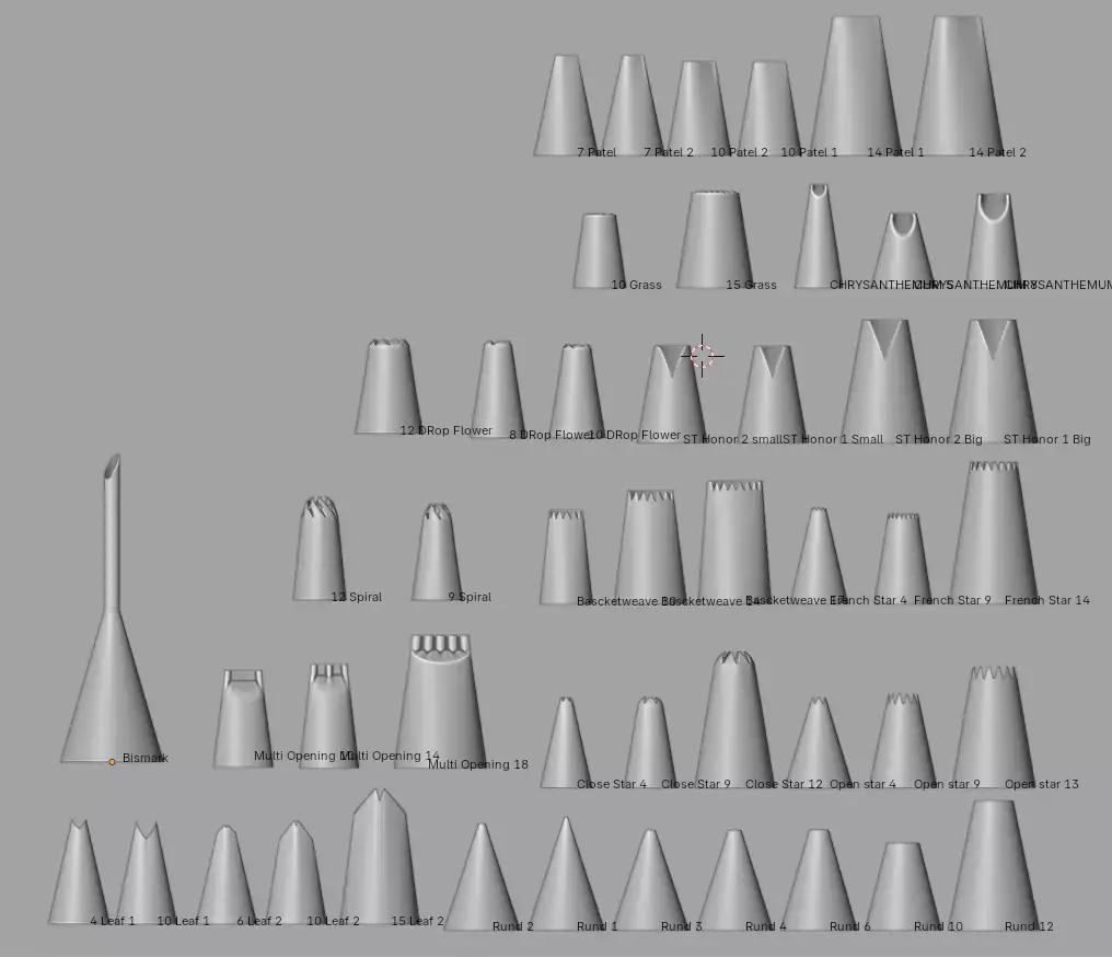 This is a complete 48-piece professional cake decorating piping tips set.Perfect for 3D printing, baking visualization, product rendering, or digital designs.