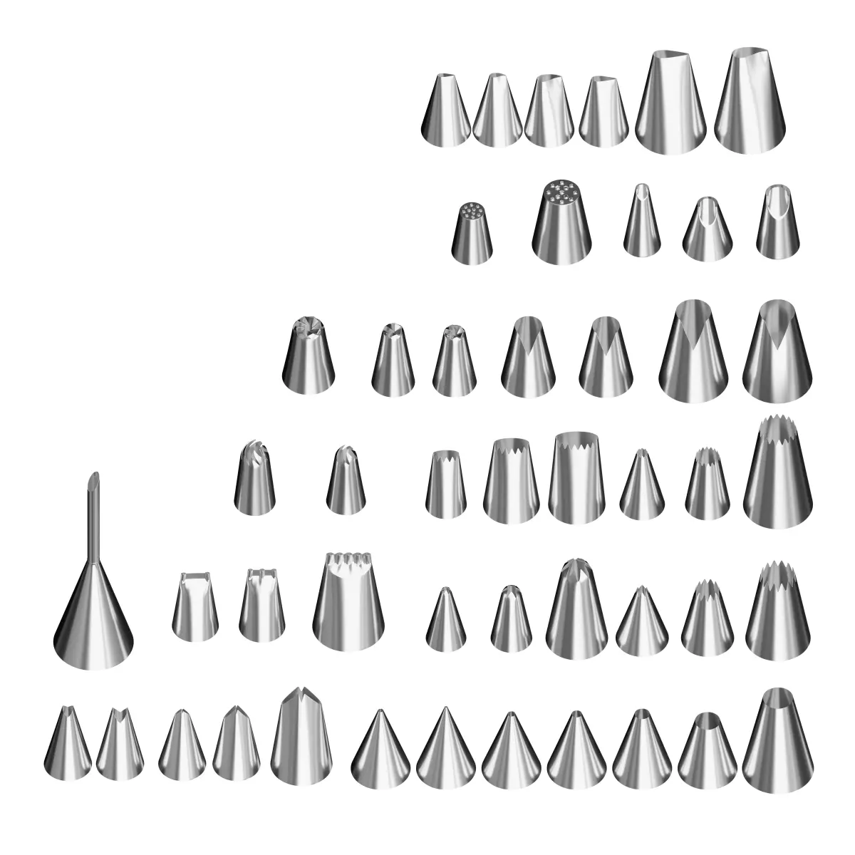 The set includes all essential piping tips used by professional bakers and cake decorators: