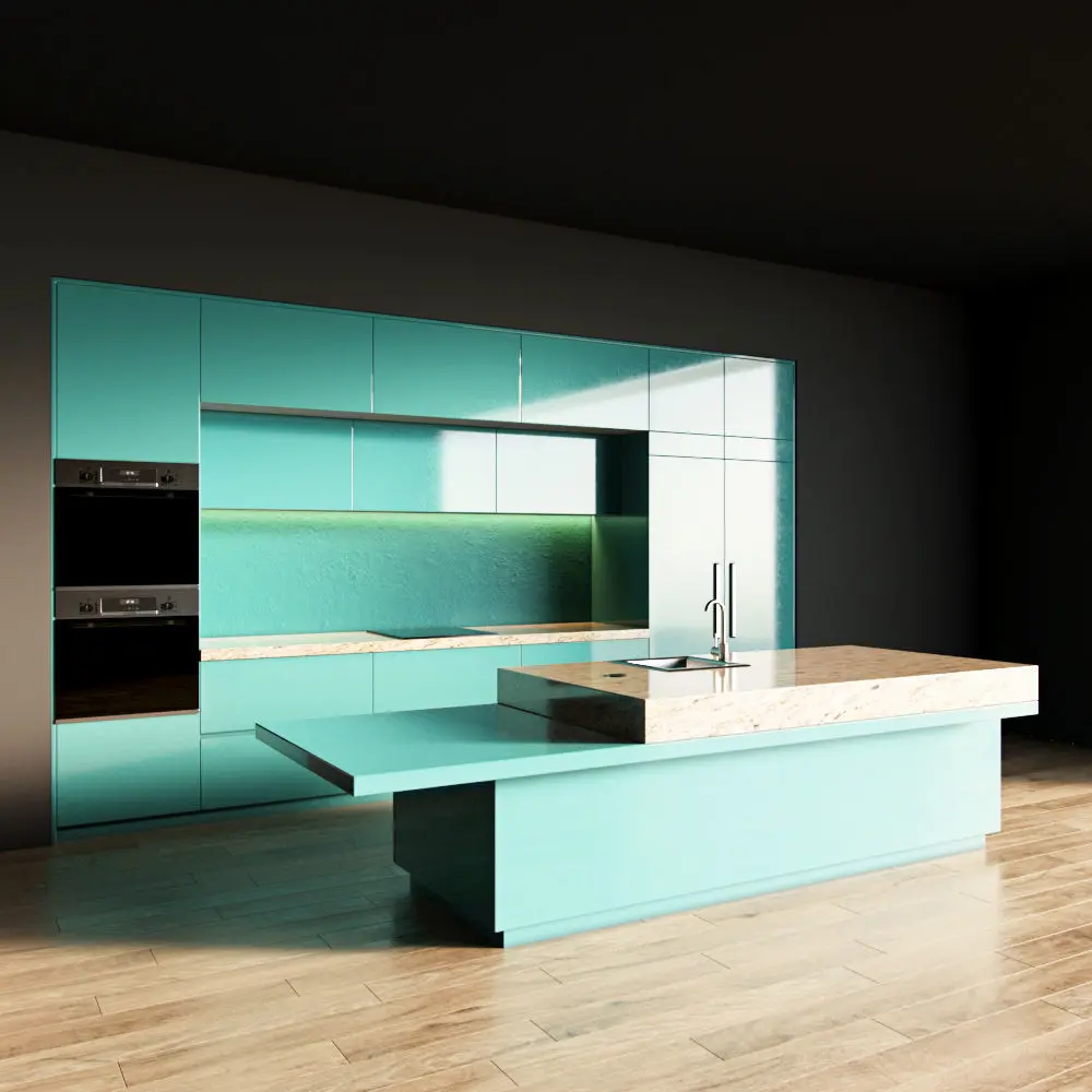 Only the kitchen and the island are present in the scene. The floor, walls, ceiling are yours.