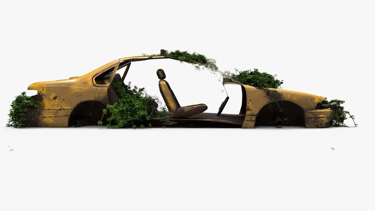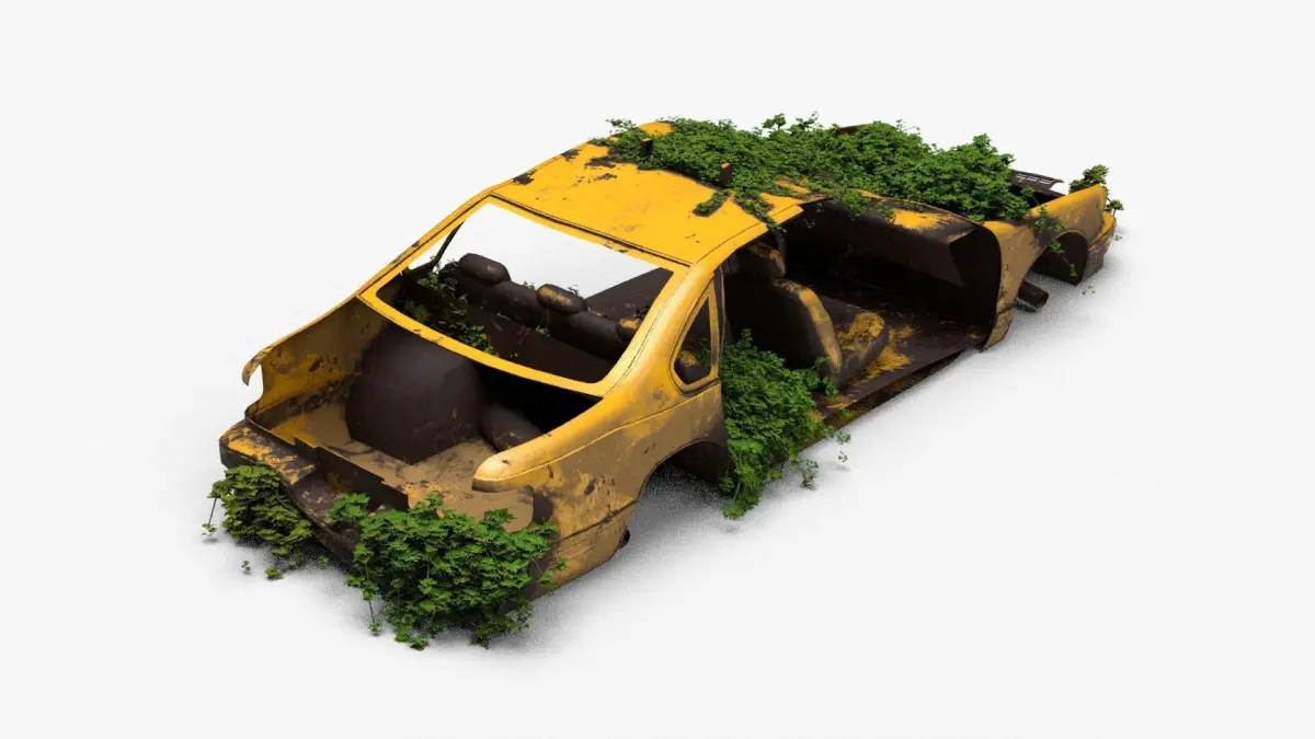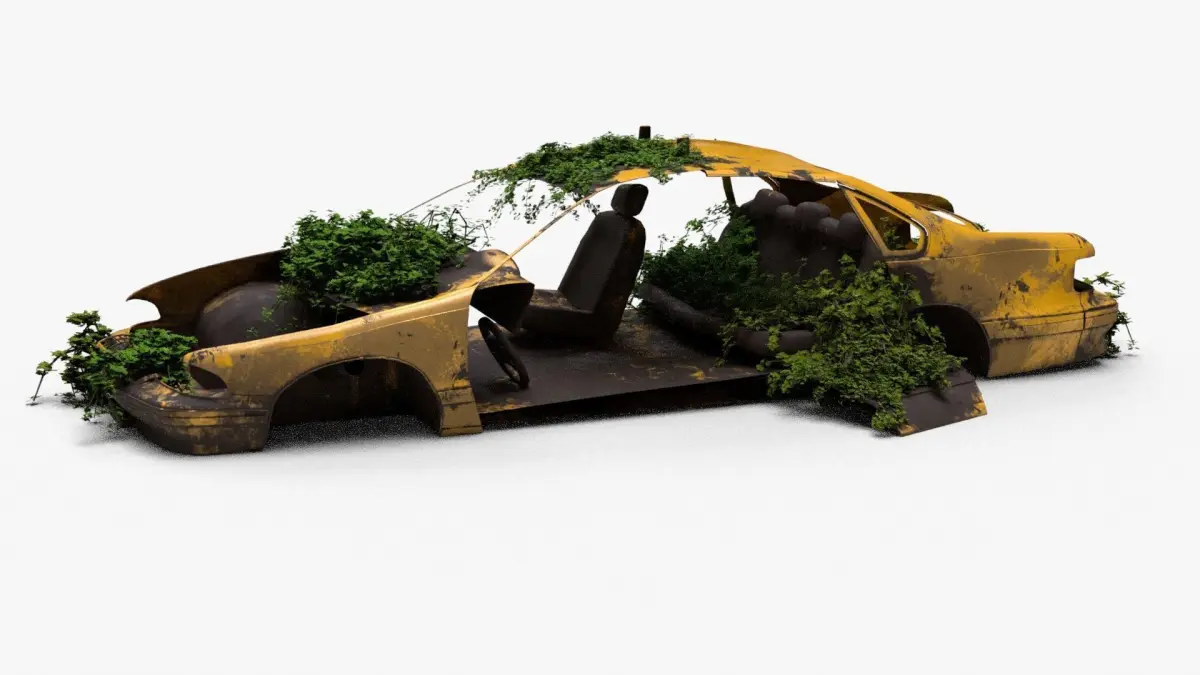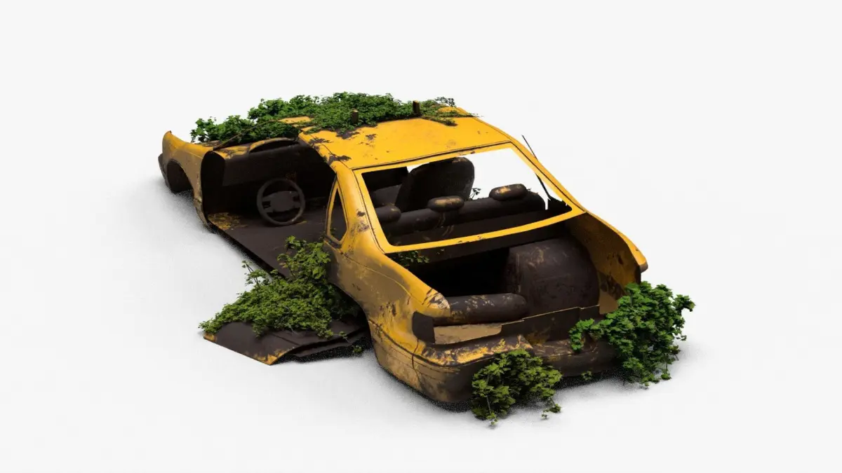 4K realistic low poly abandoned car recycle bin and rock Low-poly 3D model