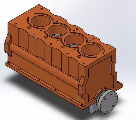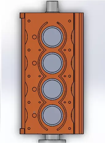 3D CAD model of the underside of a 4-cylinder inline engine, with a clear view of the crankshaft and its supporting components.It is a 2-liter 4-cylinder engine model with moving components, created in SolidWorks.