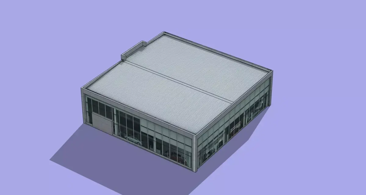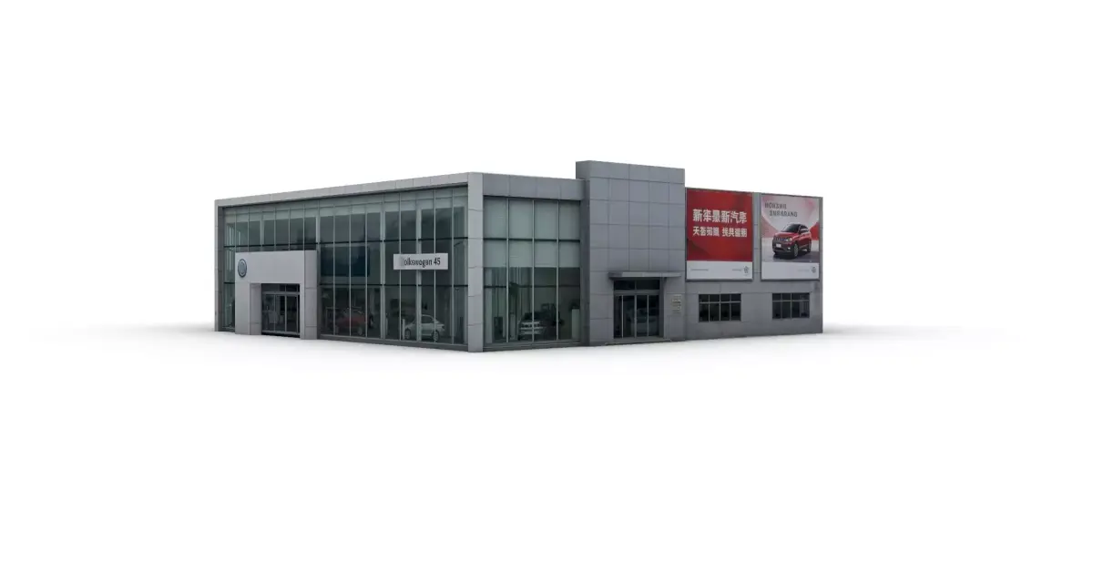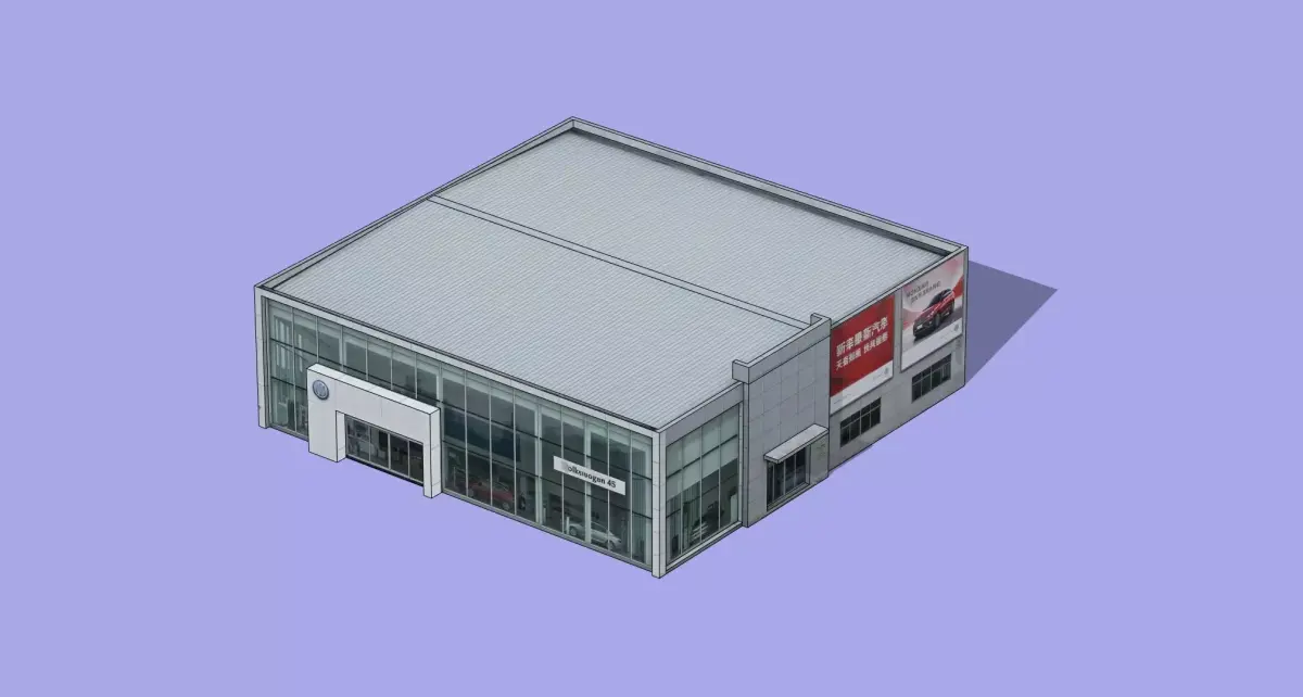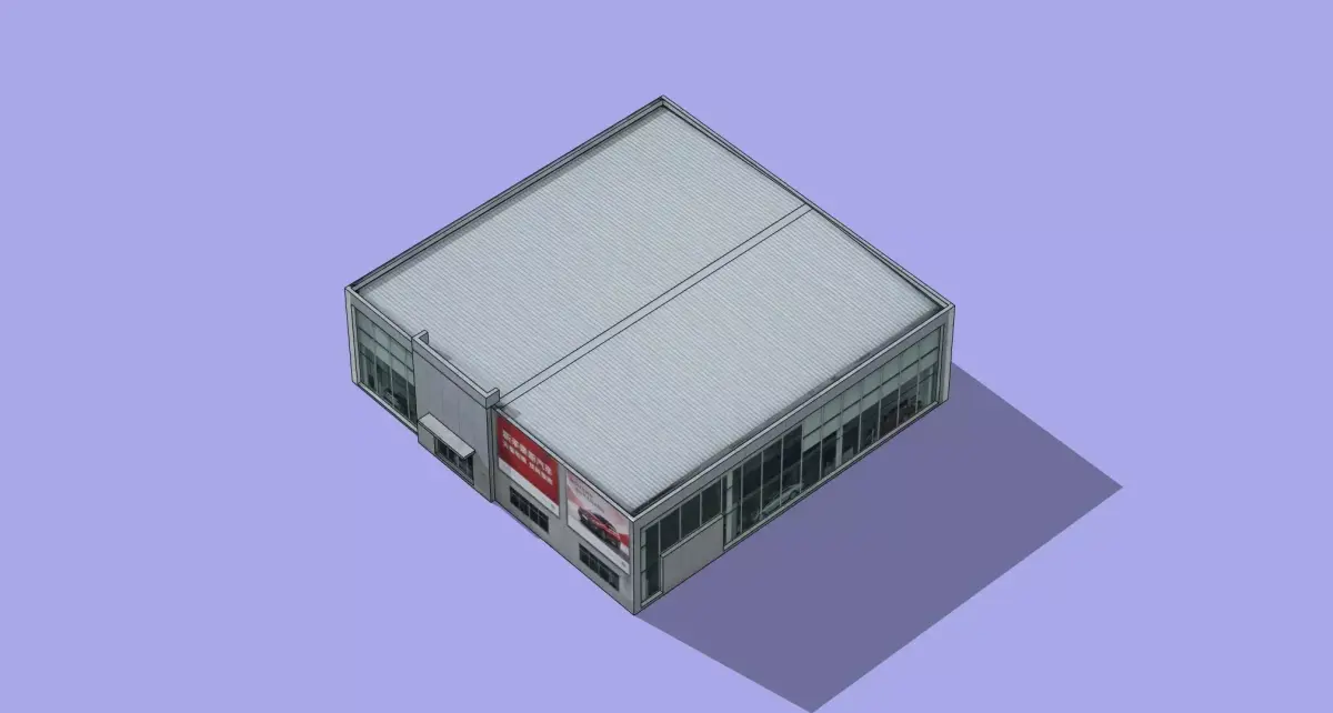This is a low-poly 3D model of a 4S dealership, designed with a clean, modern architectural style. The structure features a rectangular single-story layout with extensive glass curtain walls, a light gray corrugated metal roof, and white exterior panels. The main entrance displays the brand logo, while the side wall includes advertising space. The interior is visible through the glass, showing parked cars, making it ideal for use in game environments, urban planning visualizations, or architectural presentations.