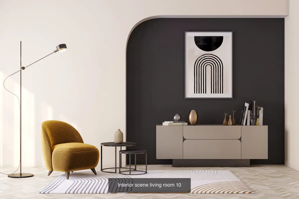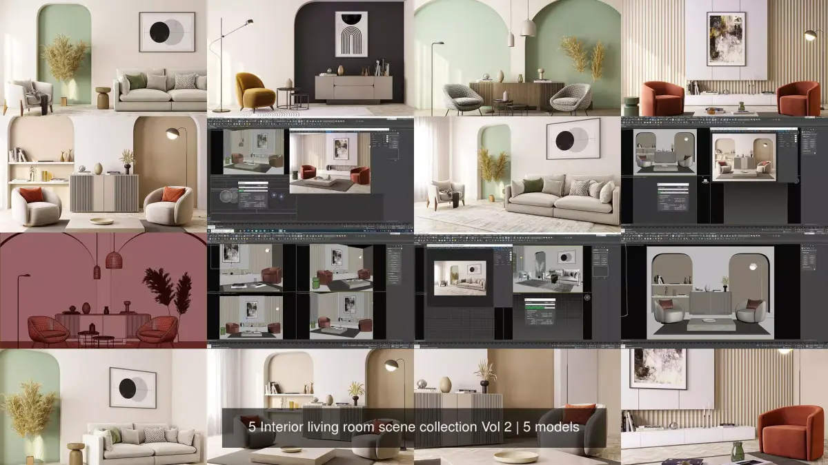 A collection of 5 fully textured interior scene with natural light setup, ready to render with Corona .