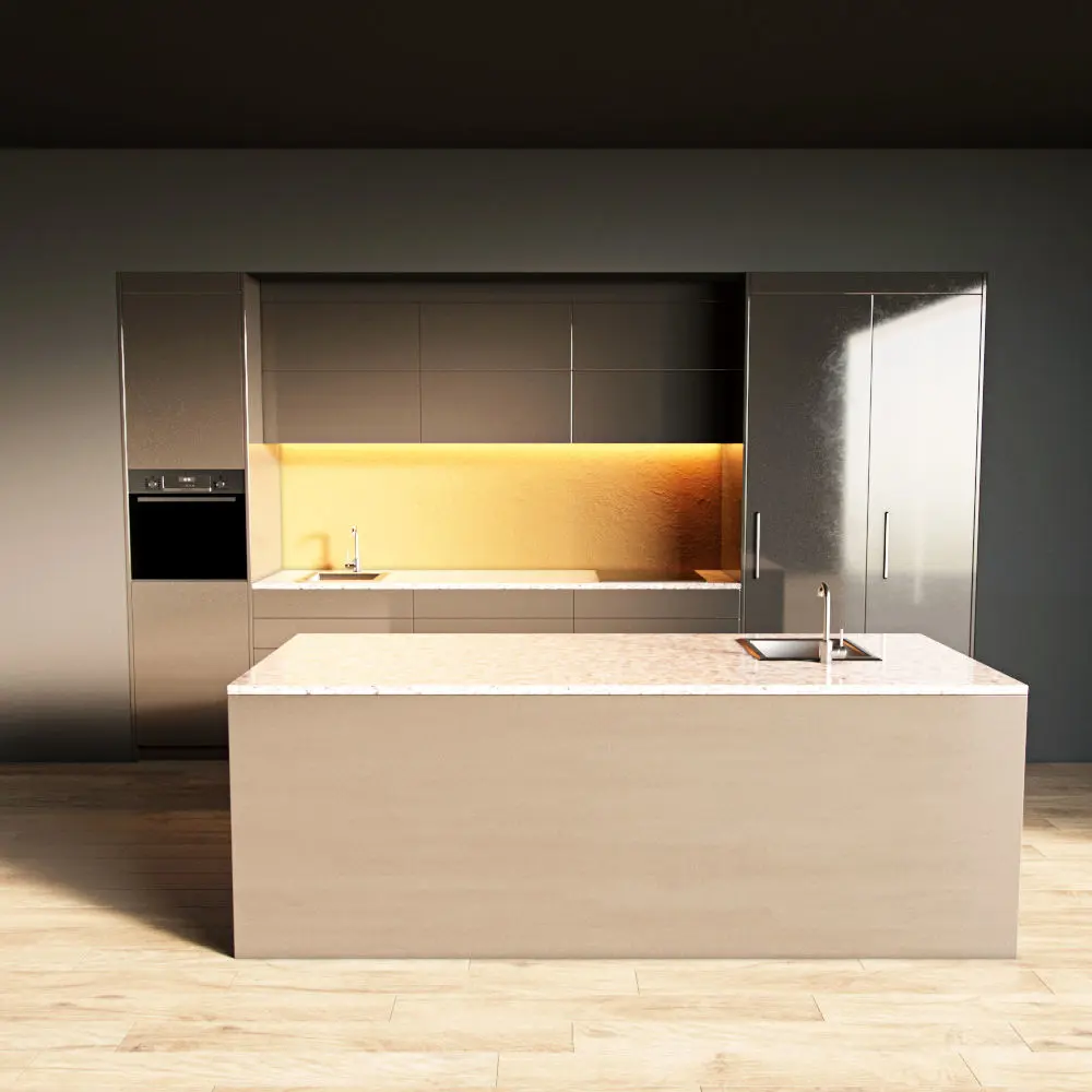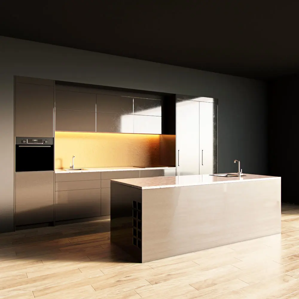 Only the kitchen and the island are present in the scene. The floor, walls, ceiling are yours.
