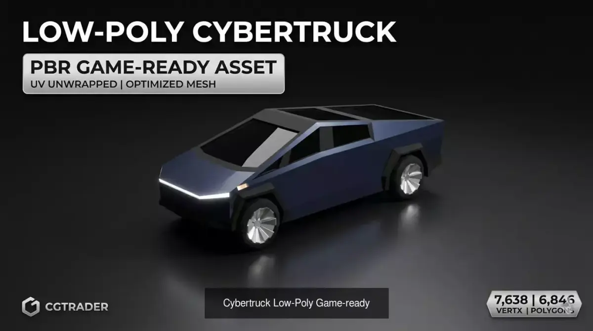 Futuristic Cyber-TruckA high-quality, performance-oriented model that stays true to the iconic, sharp-edged aesthetic of stainless steel design. With a low count of 3,646 polygons, it is exceptionally lightweight. The model includes a singular front light bar and rugged wheel details, all professionally UV-unwrapped and PBR-ready to replicate a cold-rolled industrial finish with zero overhead.