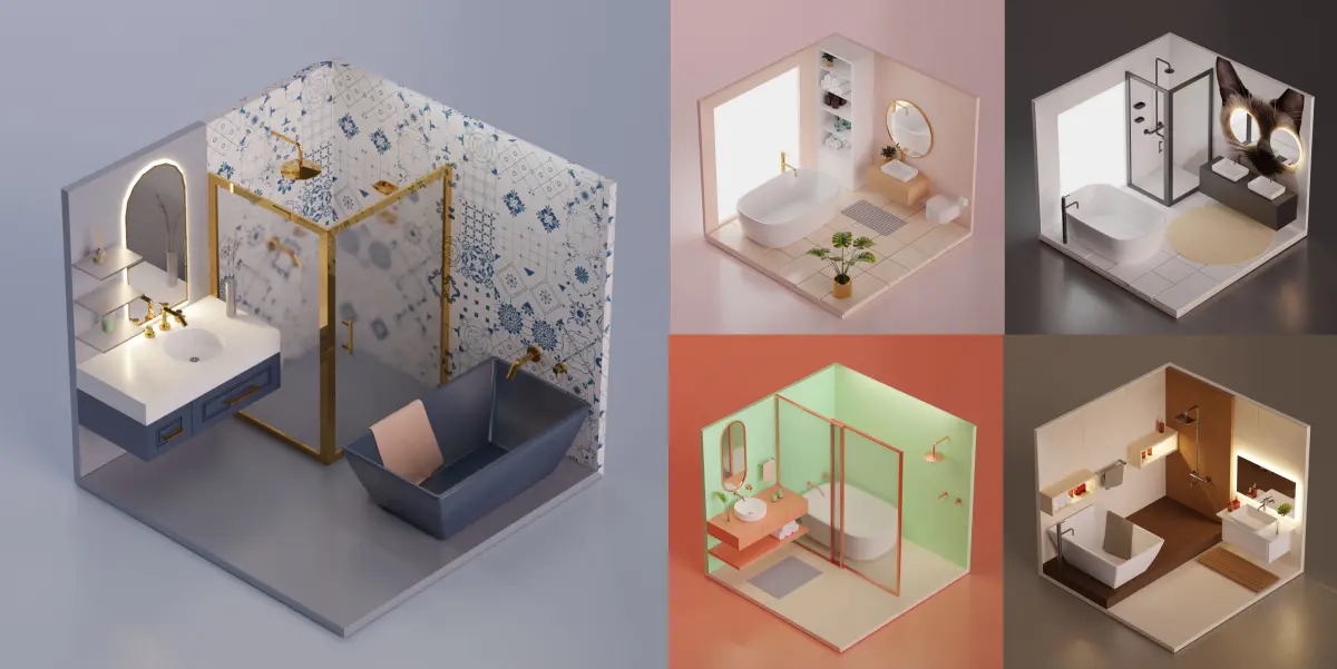5 Lowpoly Bathroom include:incense,plant, vase, glass, plant, Dumb canes , bath , faucet , Mirrors, toilets, washbasins, paper towels, shampoo, bath, towels