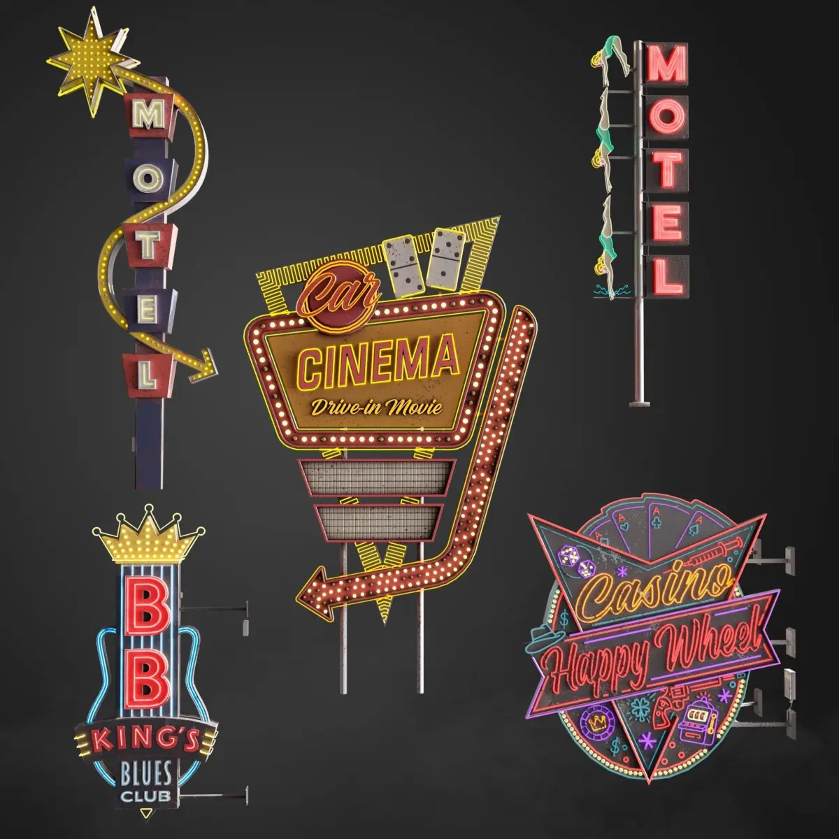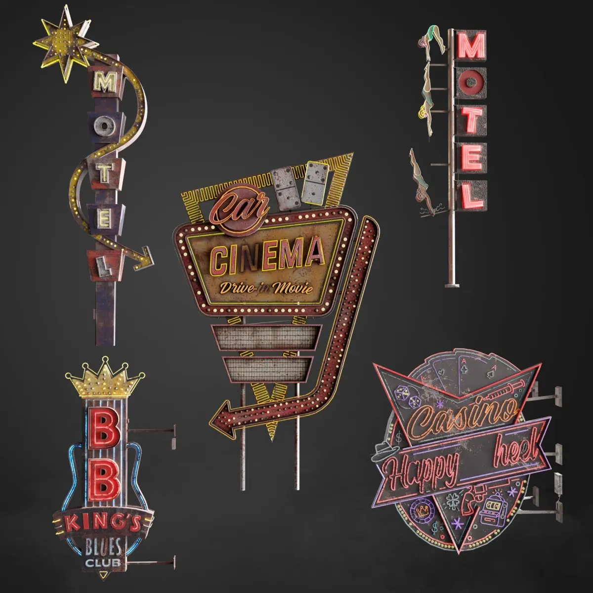 Each sign has 3 types: whole, slightly old and very old. The models are made in low poly and contain one pack of PBR textures 4k (except for the Casino sign, this model has 2 packs of textures).