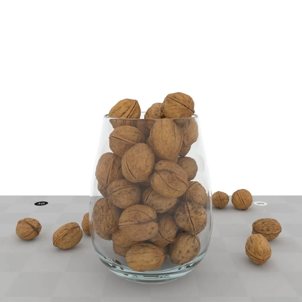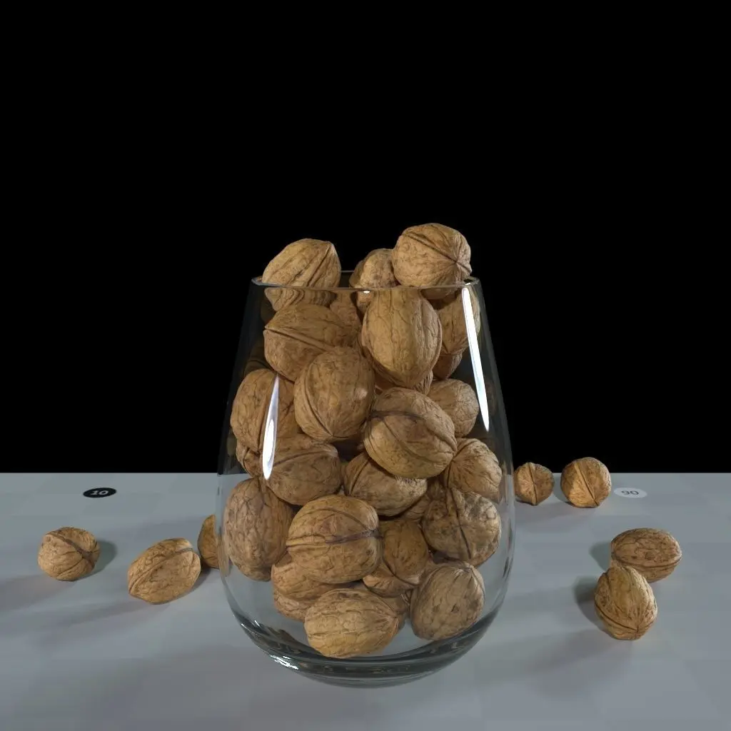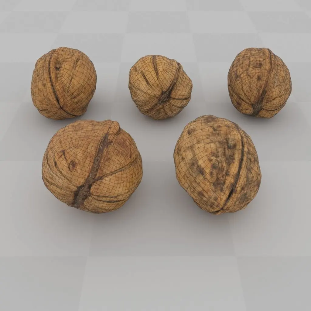 5 unique photoscanned, manually retopologized , UVed walnuts (each walnut has 1348 polygons) and a vase (6656 polygons) filled with them as a decoration prop. The whole scene has 78`100 polygons.All walnuts use the same 1 material with packed UV shells into one UV tile.