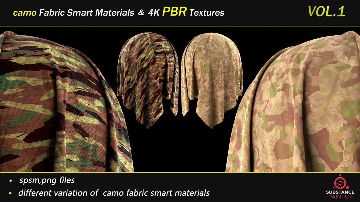 info about this product:50 High-quality camo fabric Smart Materials (SPSM)4K fabric PBR Textures(png)jpeg(preview)