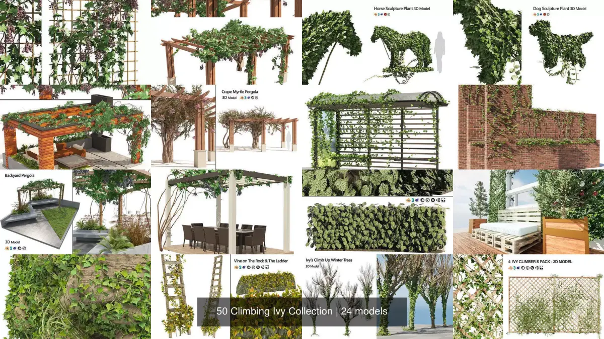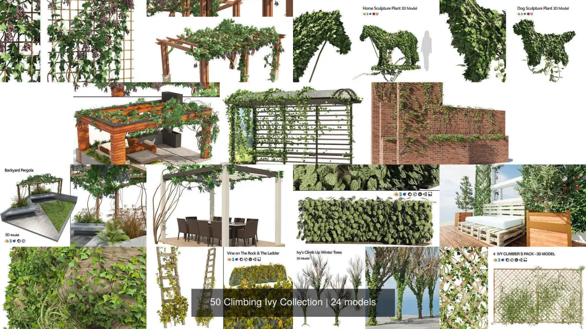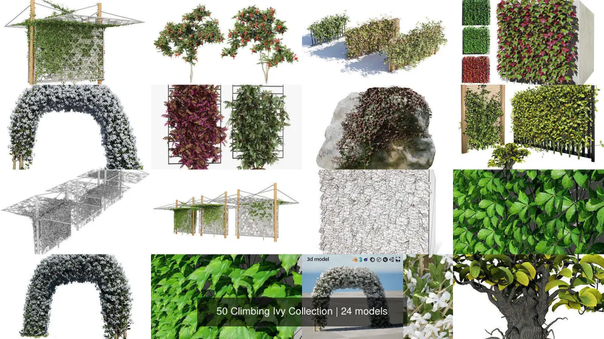 This comprehensive 3D model collection provides an extensive library of over 50 meticulously crafted ivy plant models, perfect for enhancing your architectural, landscape, and interior design projects. Each model is meticulously detailed, offering realistic textures and variations to bring your scenes to life.