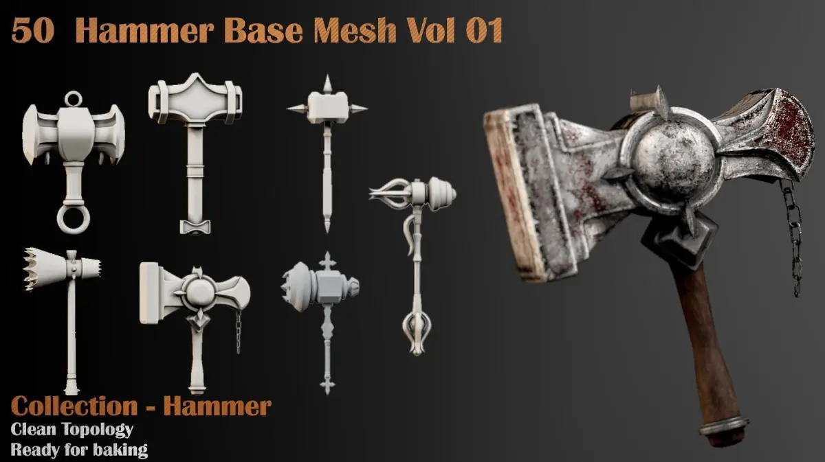 In each project, many items required by the artists consist of repetitive and similar items. To increase the speed of each artist in all tasks and parts of the project, we need a library of suitable models for various purposes, such as creating high-poly or using as a low-poly. In this package, we gather around fifty different types of Hammer for you. From Now, You can need your meet in the Hammer area with this library. All of them have proper UVs, which you can create your high-poly and bake it. All Model are under 10k tri and you can use them in game engines easily.