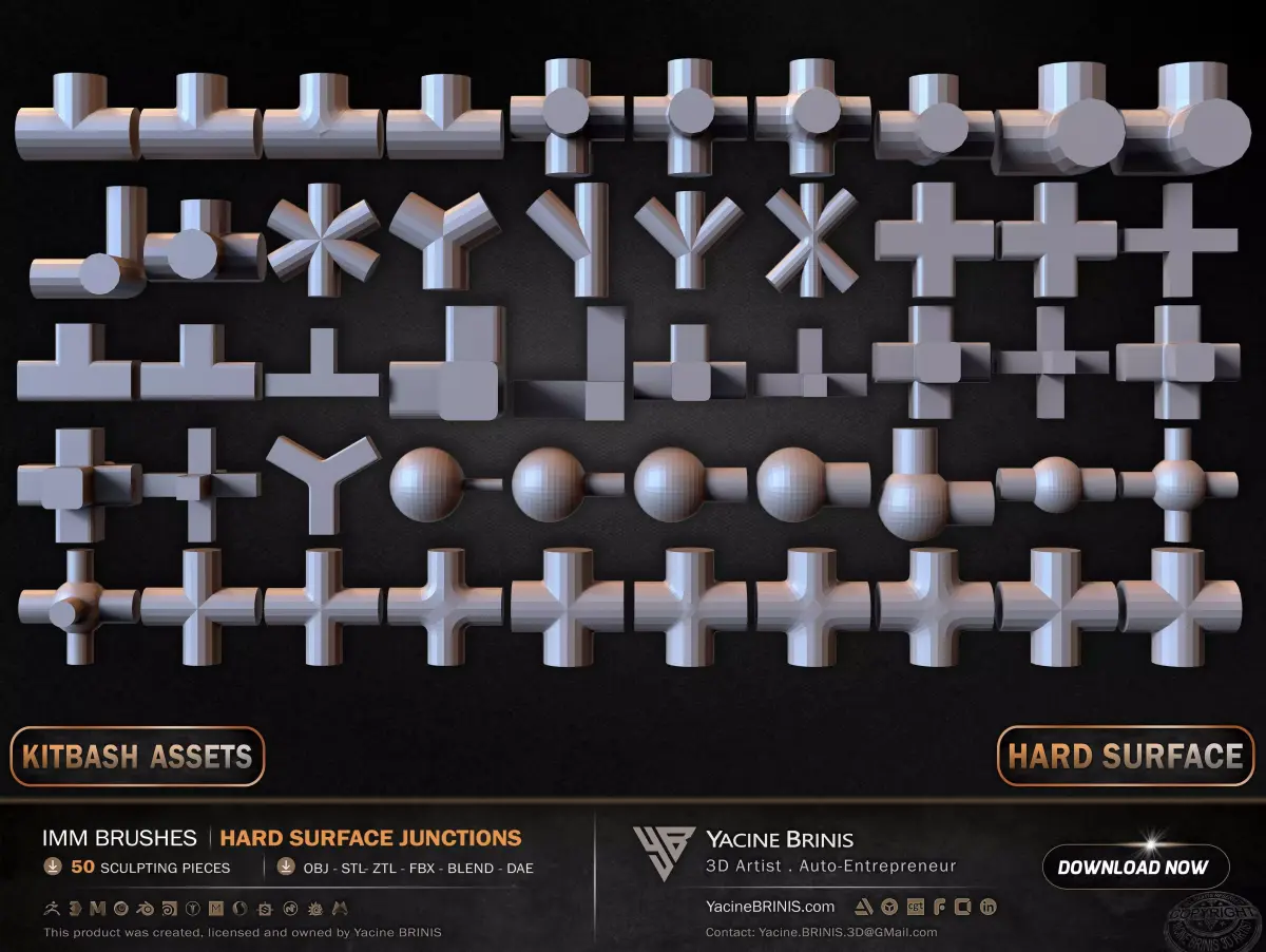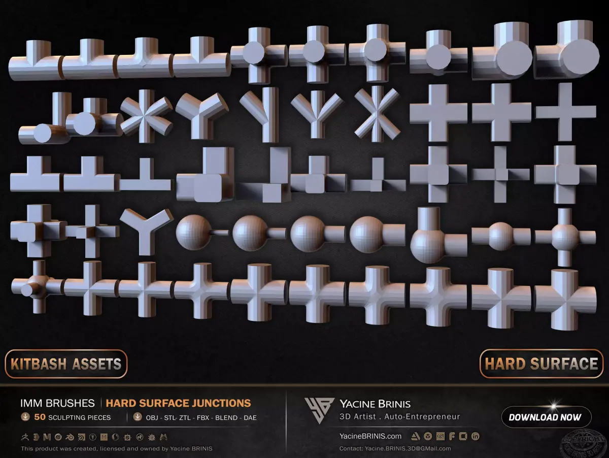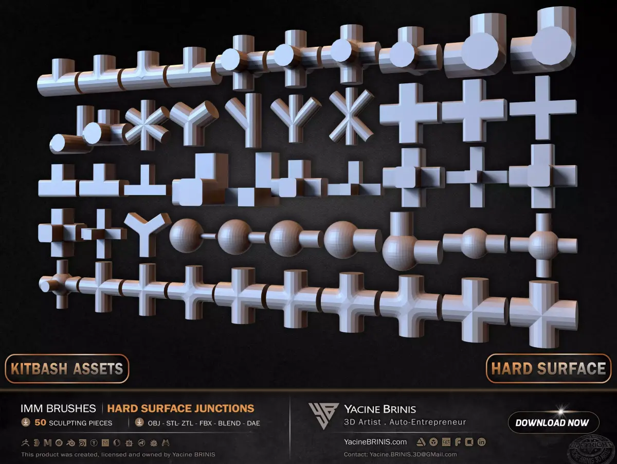 I am presenting a comprehensive collection of 50 hard surface IMM junction elements, structured for modular construction, pipe systems, and complex hard surface assemblies.