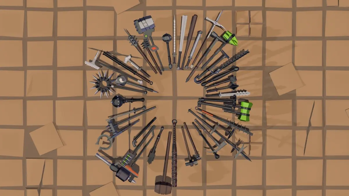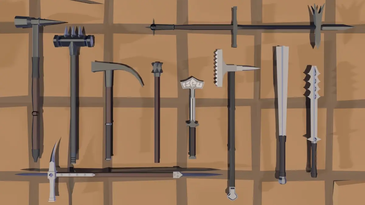 A big collection of low poly hammers, maces, clubs, etc, historical, fantasy and futuristic designs, simple easy-to-edit designs, over 100 palette swaps, low poly, great for games, works well with low poly packs like Synty or Acheron Series.