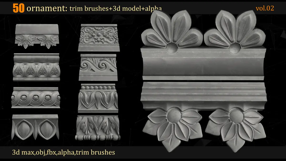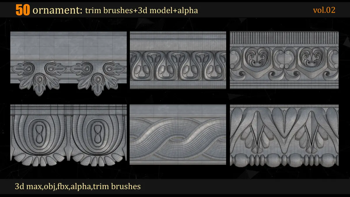 50 Ornament Trim Brushes+ high poly 3D Models(max,obj,fbx) + 4k Alpha