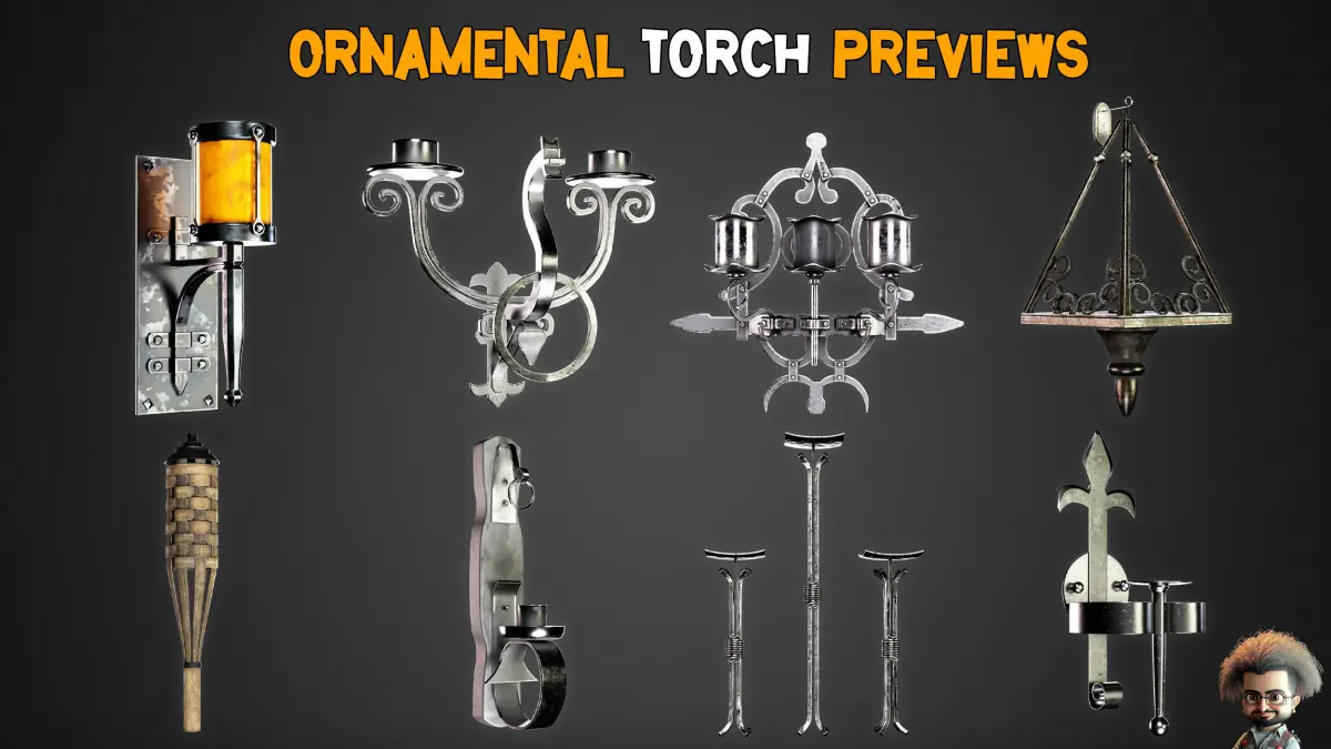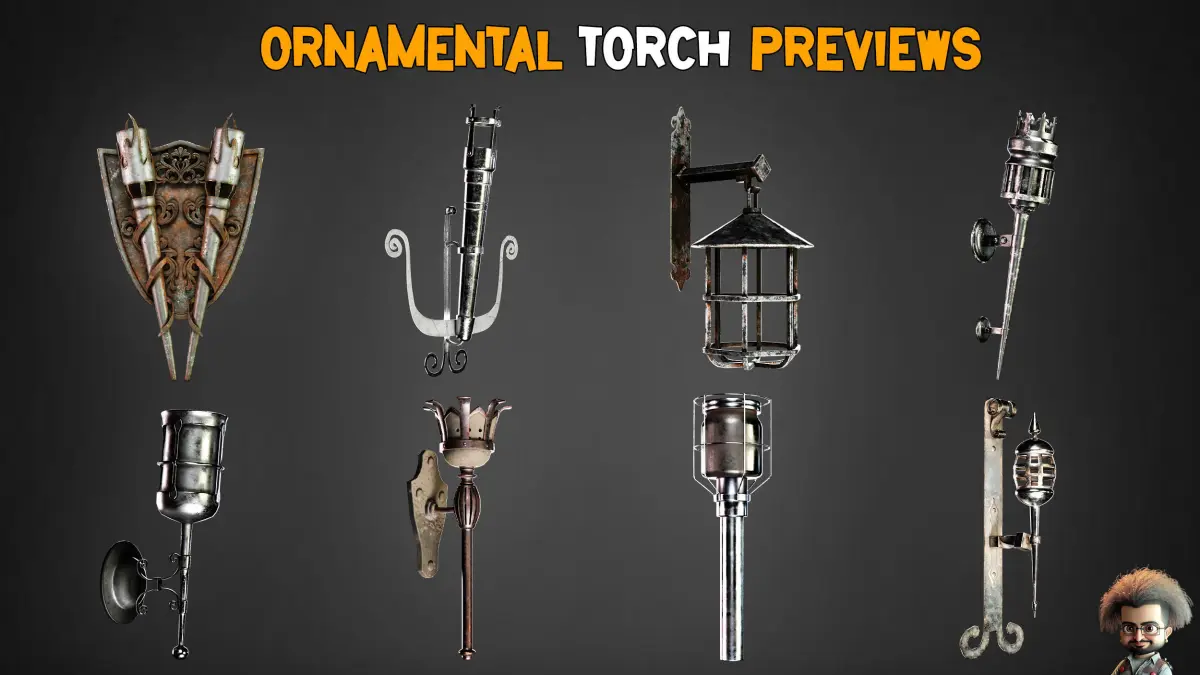 . Here is a set of 50 Ornamental torches, Having game assets can increase your speed in creating a game environment, that's why we have prepared a unique torch pack for you, which is ready to be used in your games and animation projects.