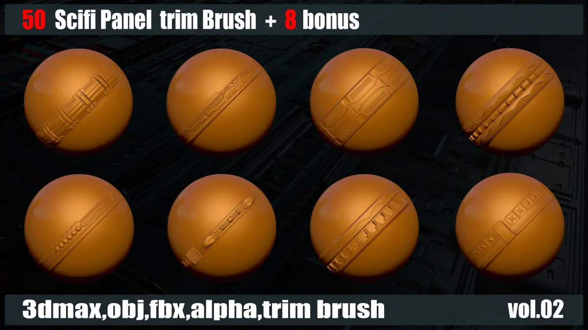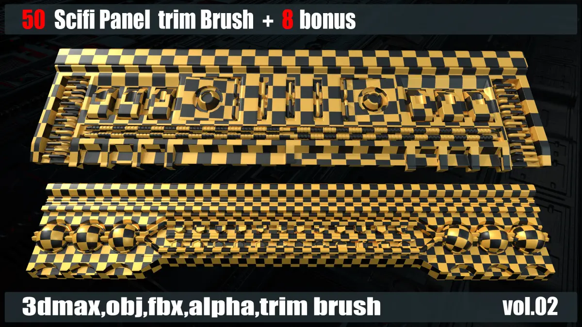 This Product includes 50 scifi panel trim brush +8 bonus for Zbrush and 50 3d models for use any 3d software 3dmax,maya,blender,C4D,.. 50 scifi panel Trim Brushes+8 bonus high poly 3D Models(max,obj,fbx) + 4k Alphaand also you can use alphas for substance painter and any program that can use alphasabout Product : 50 trim Brushes & Alpha (4k Resolution )8 hard surface 3d model bonusZbrush Brush (ZBP)58 High poly 3D models Max file