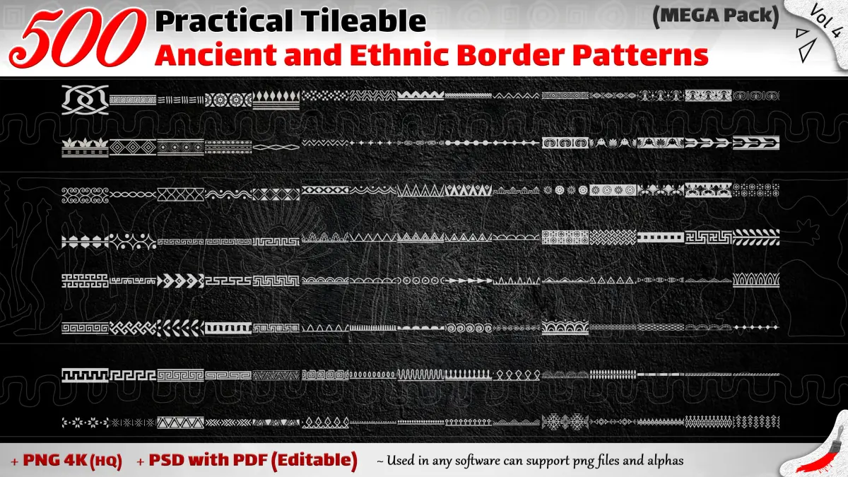 - 500 tileable ancient and ethnic border patterns (Alphas)