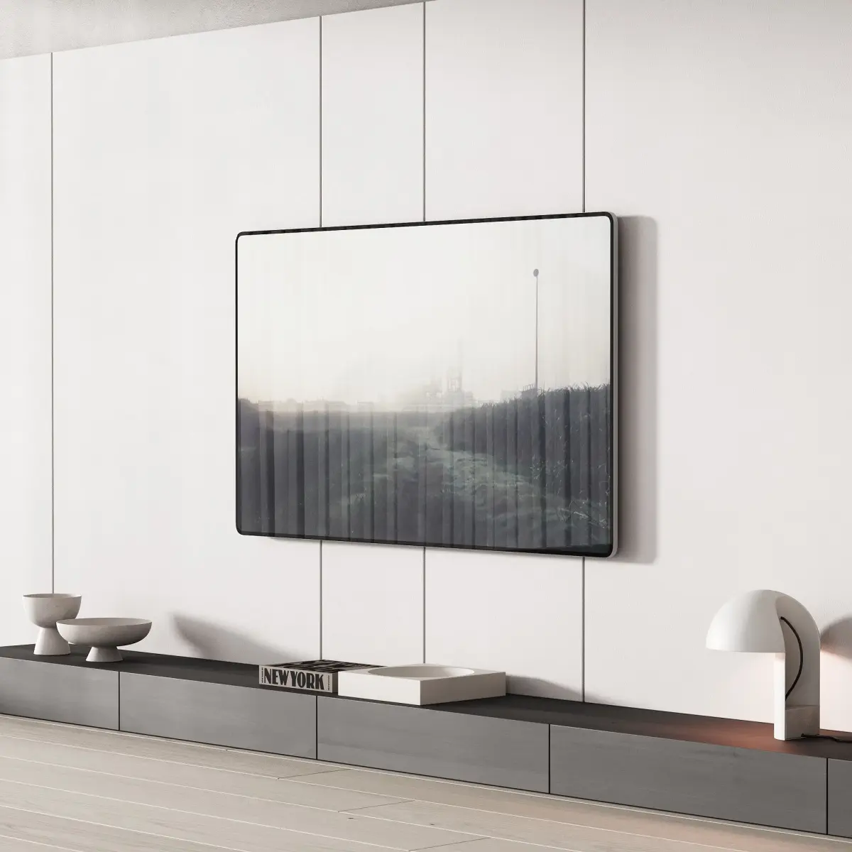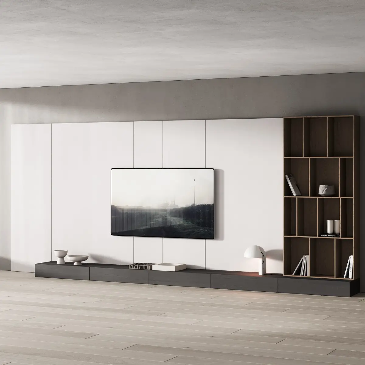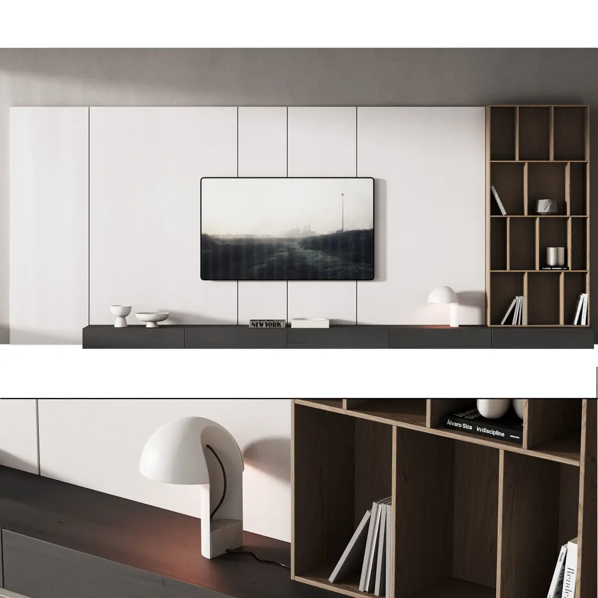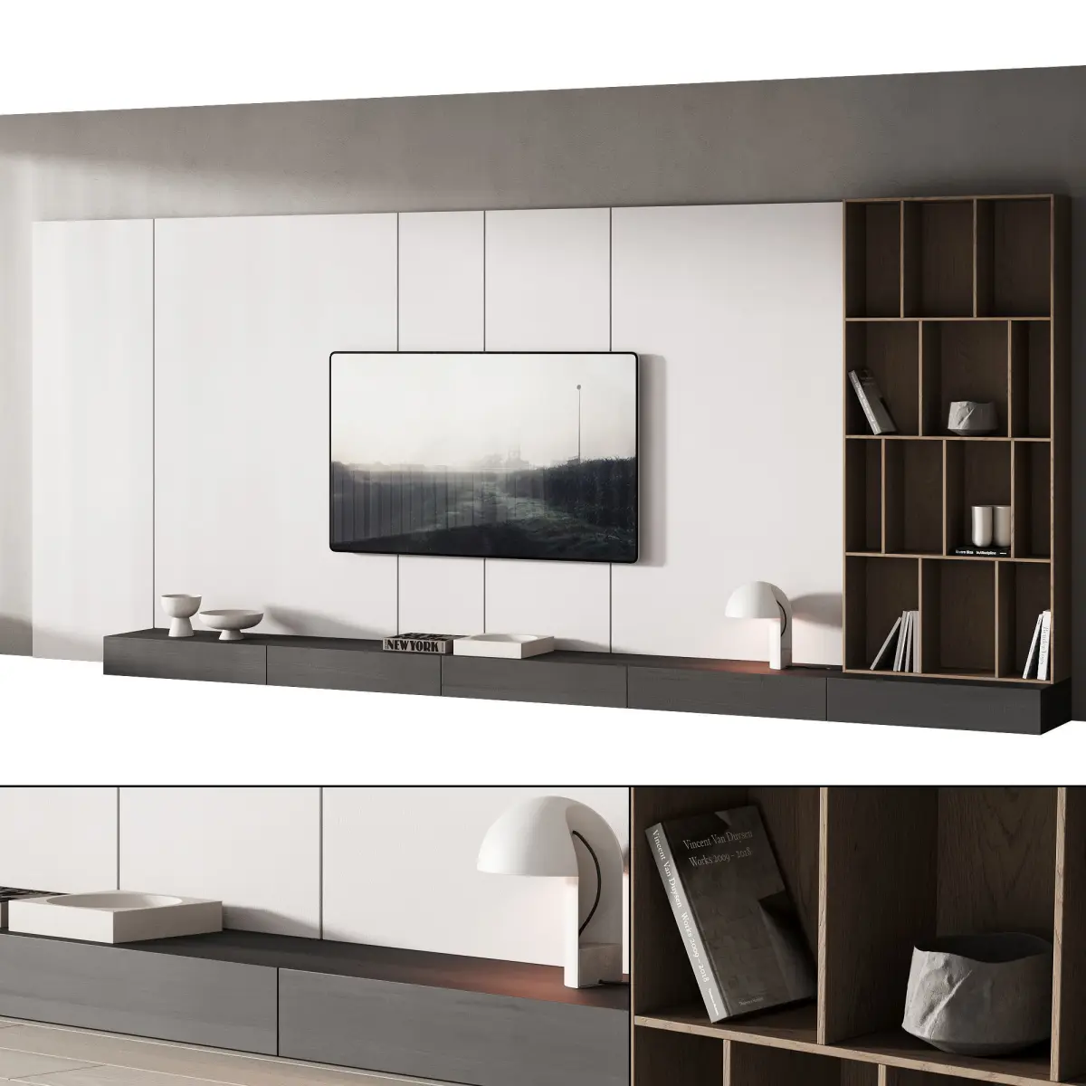 The model has 2 TV options - on and off (demonstrated in the preview).The model includes: a TV console with drawers, a shelf with decor (books, vases), a wall panel, a bowl, a tray, a table lamp