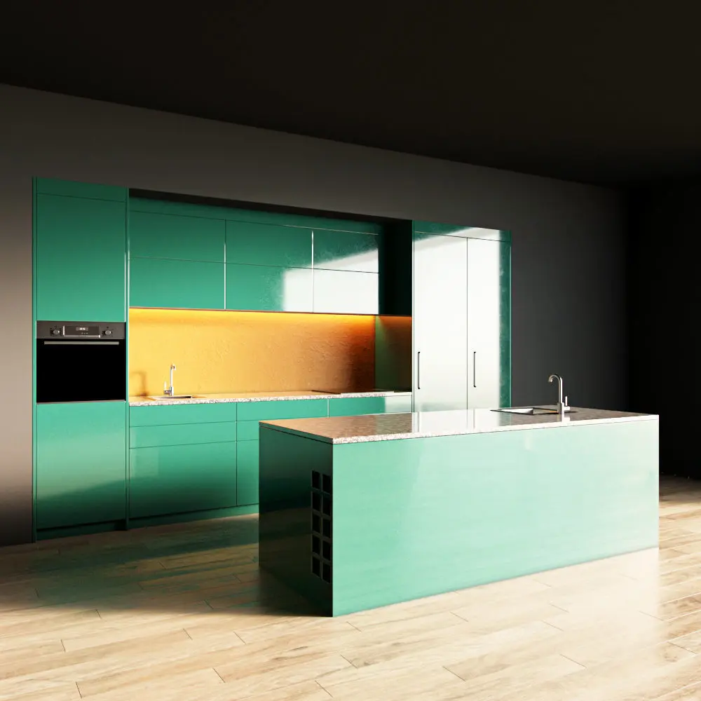 Only the kitchen and the island are present in the scene. The floor, walls, ceiling are yours.