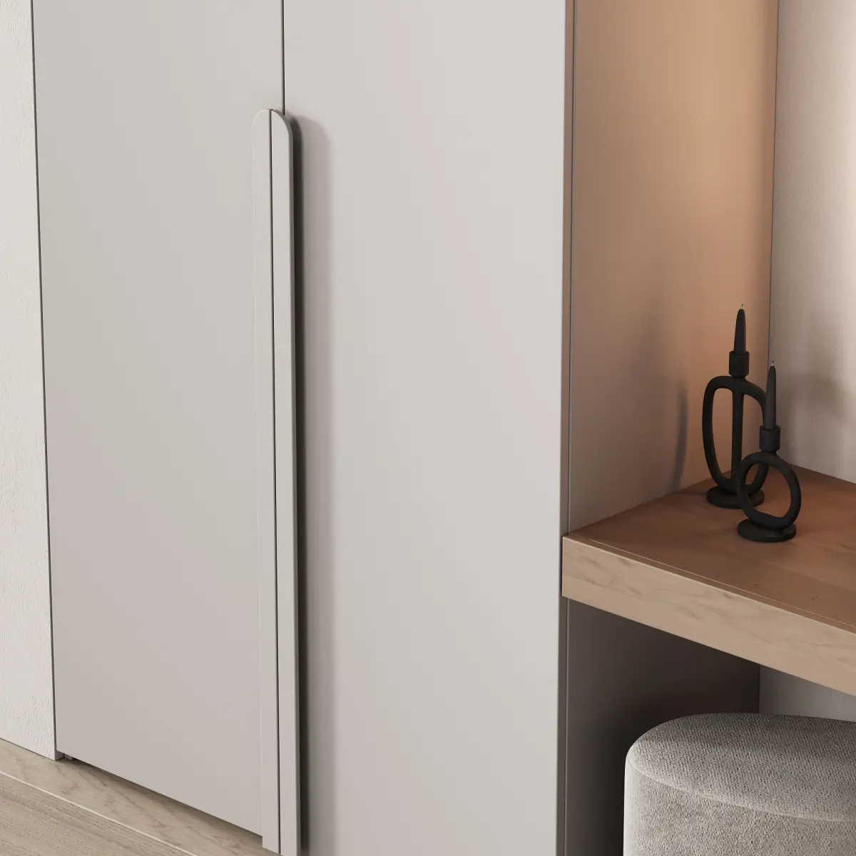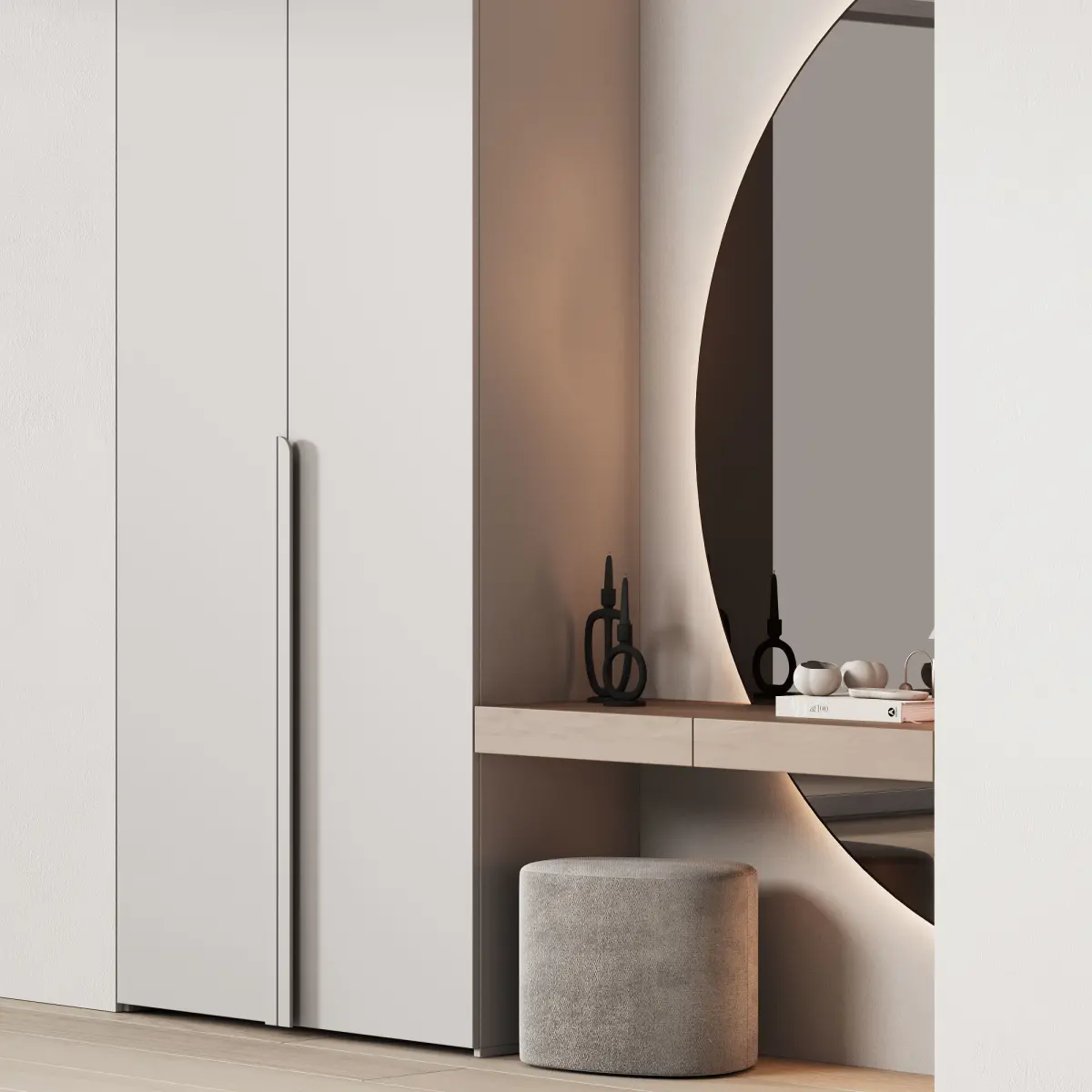 3D model: hallway area modular floor cabinet / wardrobe, semicircular mirror with backlight, pouf, decor. Perfect for hallway, corridor, hall, bedroom, office