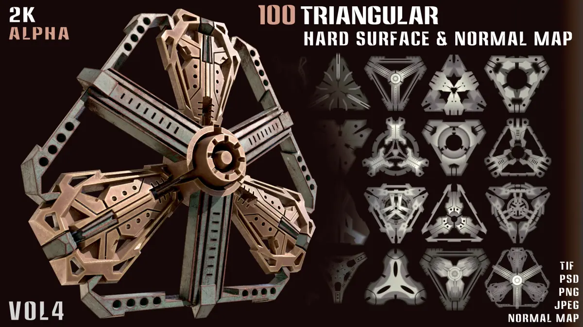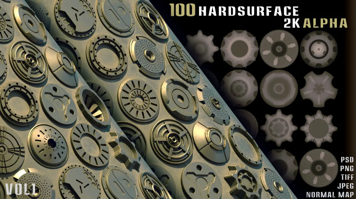 100 Hard surface Alpha - Vol1 120 Hardsurfase Alpha & Normal Map - Vol2150 Hardsurfase Alpha & Normal Map - Vol3100 Triangular Hardsurface Alpha and Normal map - vol4100 Square Hardsurface Alpha and Normal map - vol5