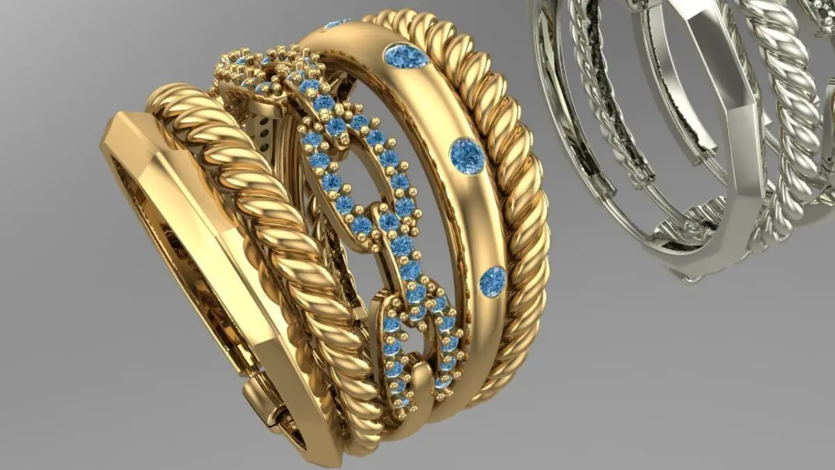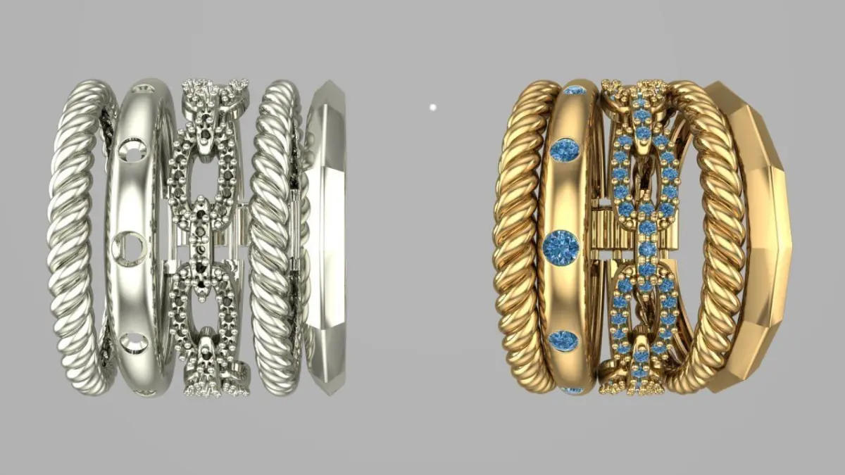 We have similar designs which is in one piece and can not move freely like this design in your finger. Its a combination of 5 minimal ring that been constrained from the bottem of the rings but have a free motion.You can arrange or even have mirror design when you are joining them in the final process.We only gave the meshes so if you want any changes just contact us