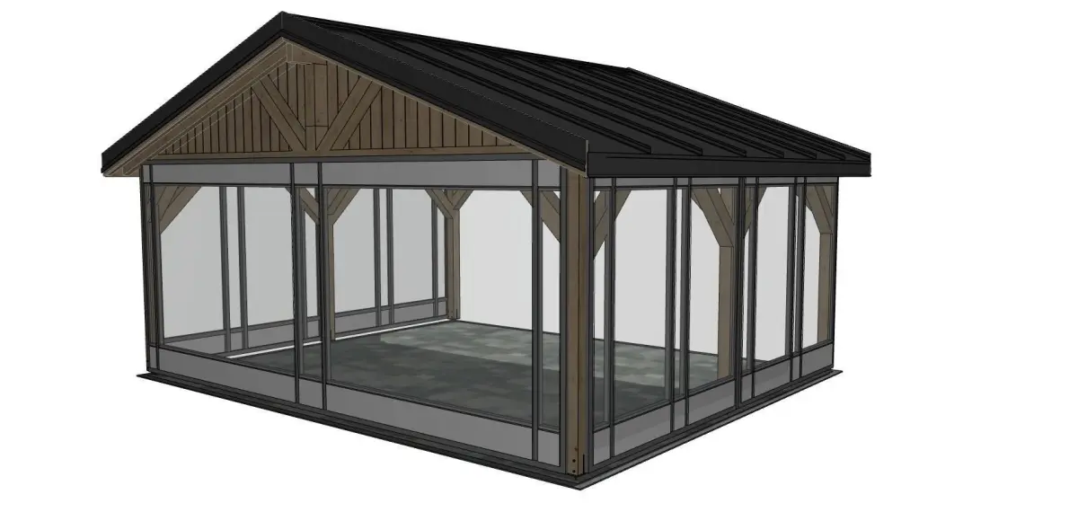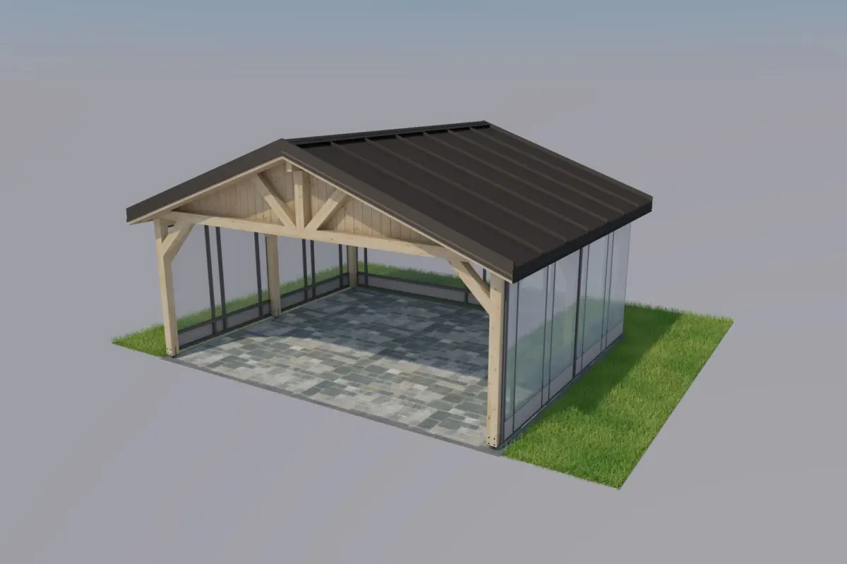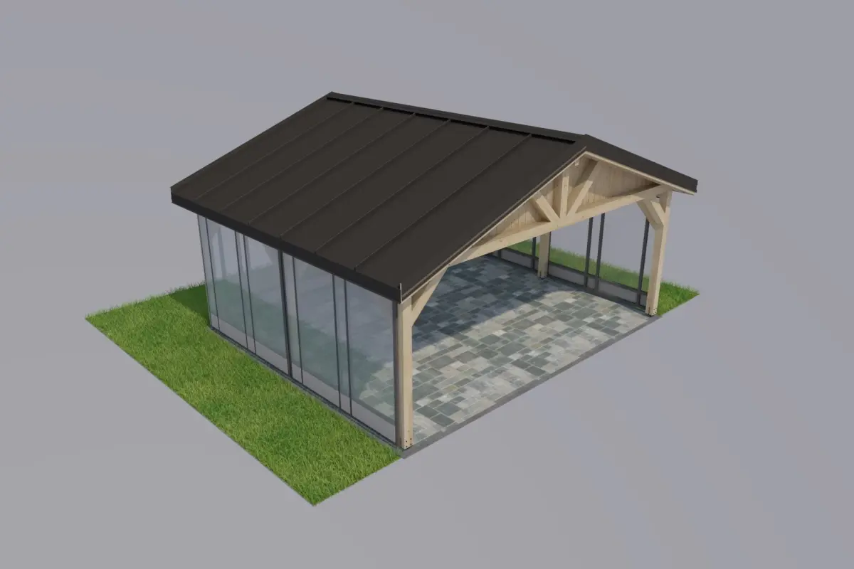 Shed model with dimensions of 6x5m along the width of the columns, columns with a cross-section of 14x14cm, the horizontal beams are designed in the same way. The whole thing is covered with full boarding and a click sheet on top of it. The sides are glazed systemically, the material is glass and foiled glass.