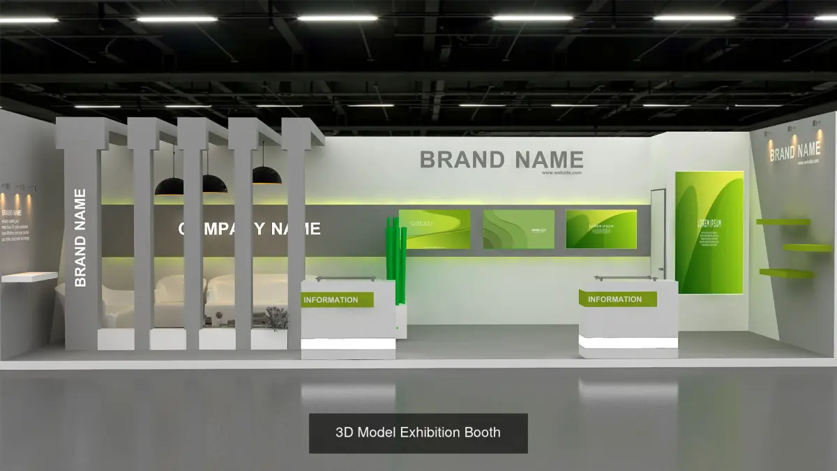 6 Practical Exhibition booth standSize and scaleinclude design all necessary area in Exhibition and Booth Such as Vip and Storage and Counters and also Stand for productsFormat: max (all version from 2016 and up ) Blender/ FBX / 3DS / OBJ /DWG/ GLTF/glb Engine of