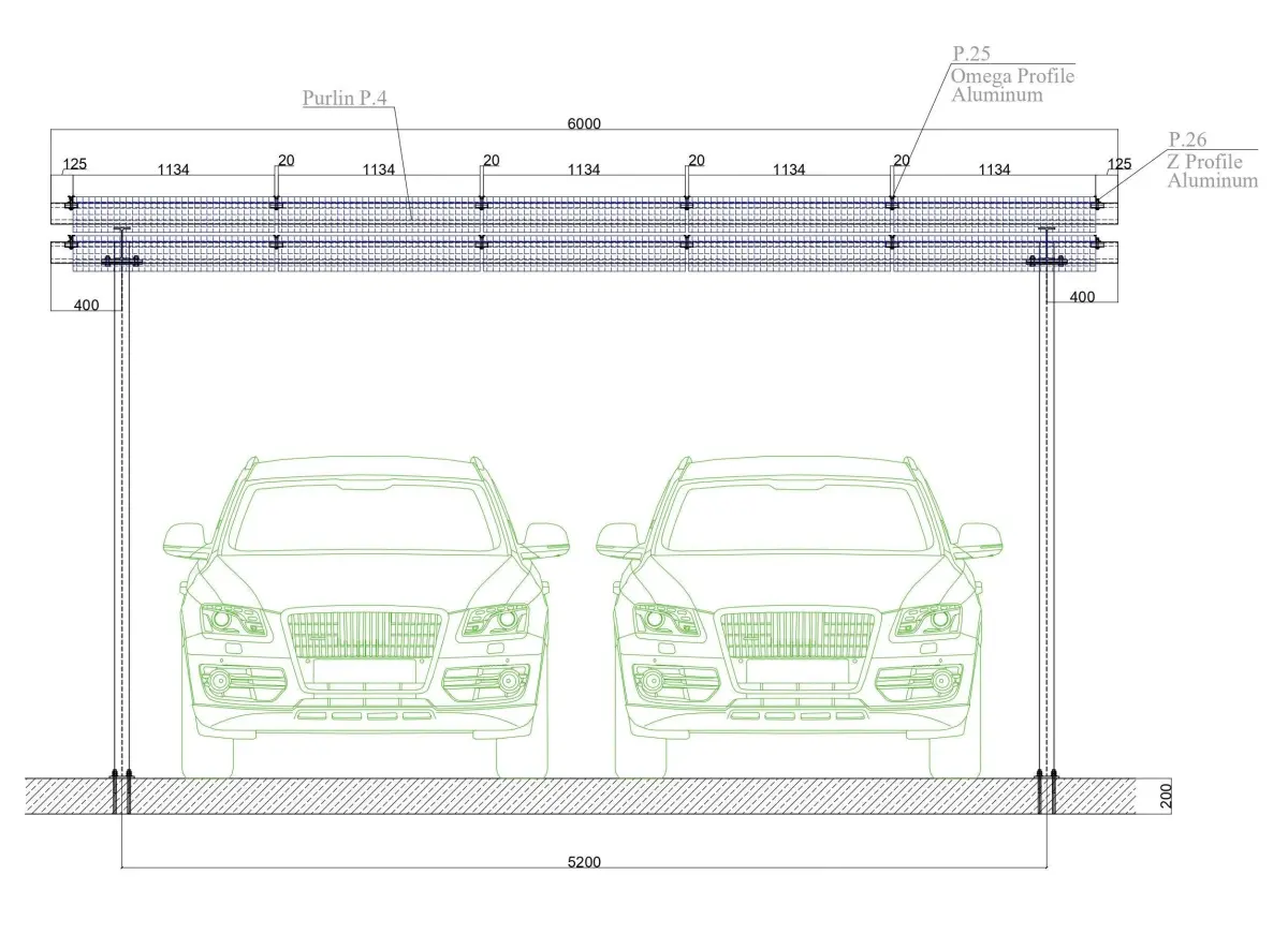 1 solar carport steel construction produces 68,25 kWp power in 1 hour