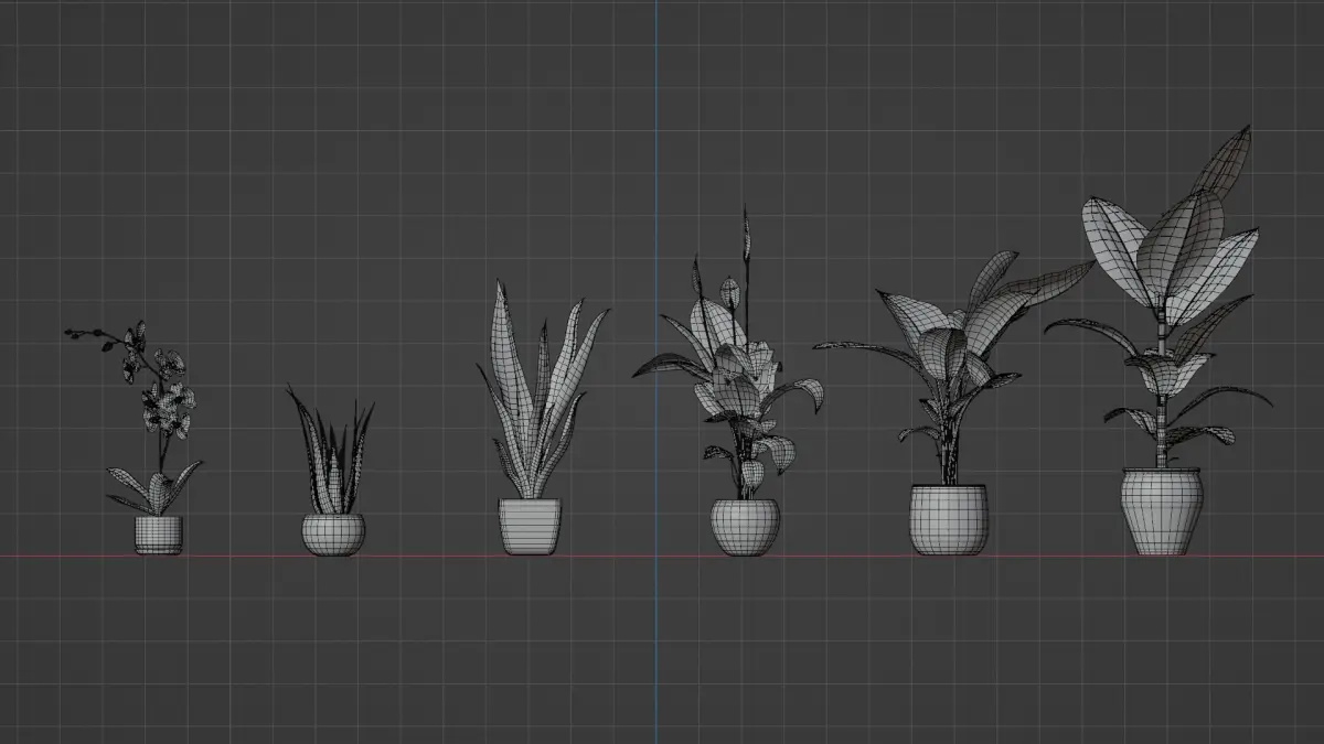 Pack include 6 plants (Plants Pack - Orchid / Calathea / Aloe Vera / Ficus / Peace Lily / Snake Plant). All textures taken from real plants. Textures resolution are 2048 and 4098 px and consist of: BaseColor / Roughness / Normal, as well as additional Subsurface (Value) / SubsurfaceColor. The models comes with 4 types of soil and 15 variants of pots. It can be bought separately.