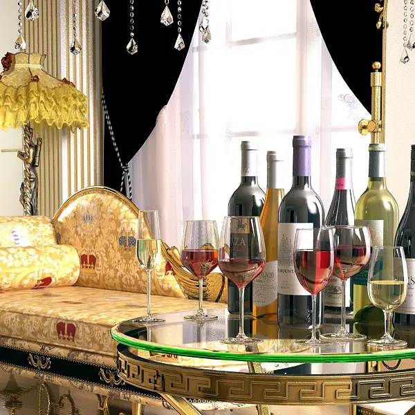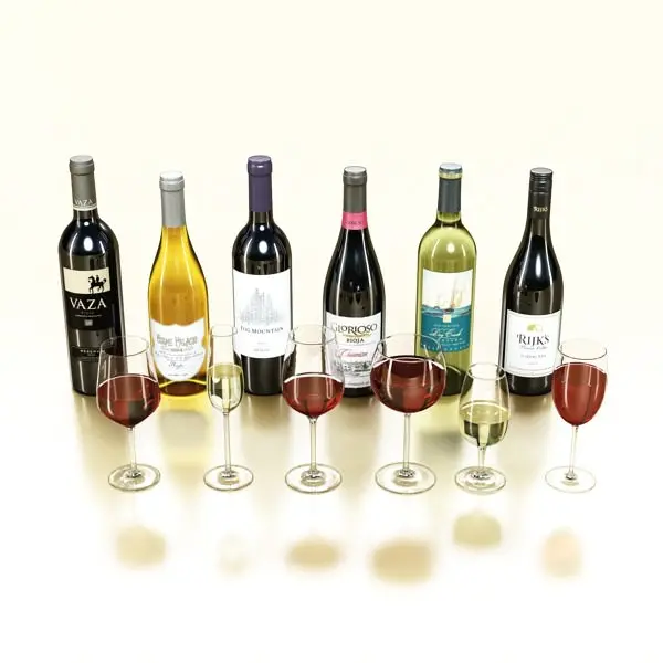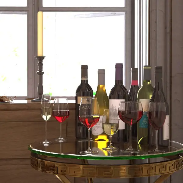 Photorealistic and High Detailed 6 Wine Bottles and 6 Wine Glasses.