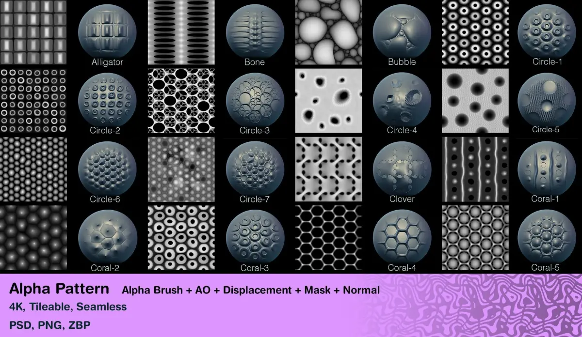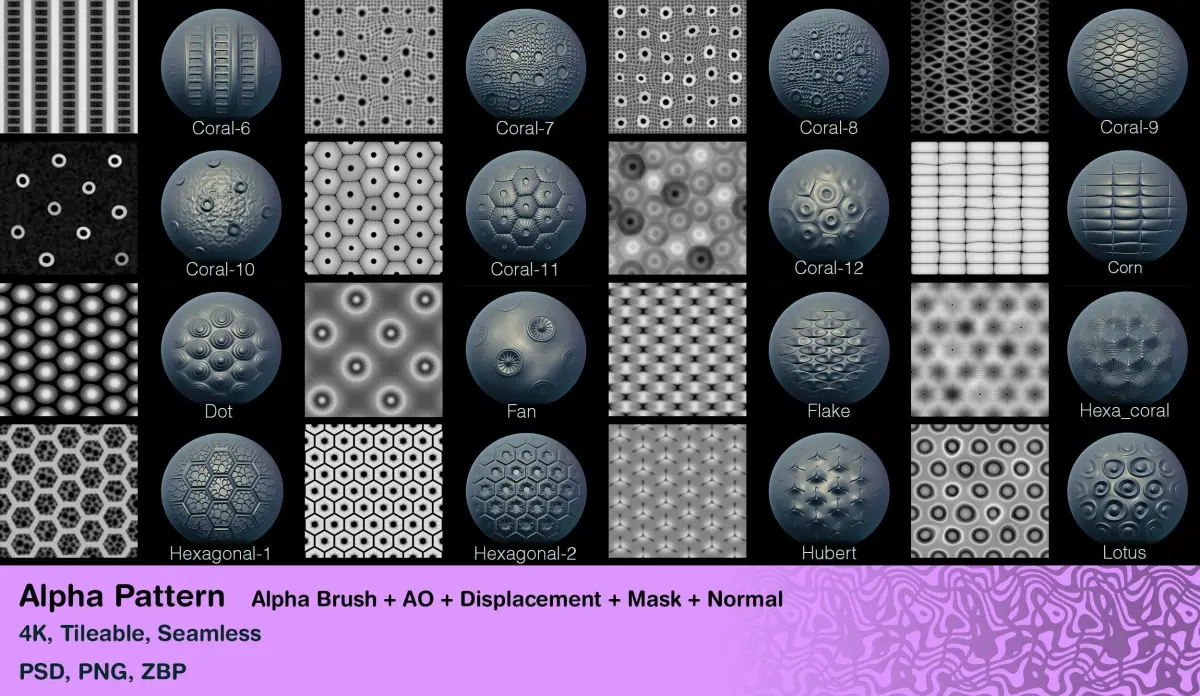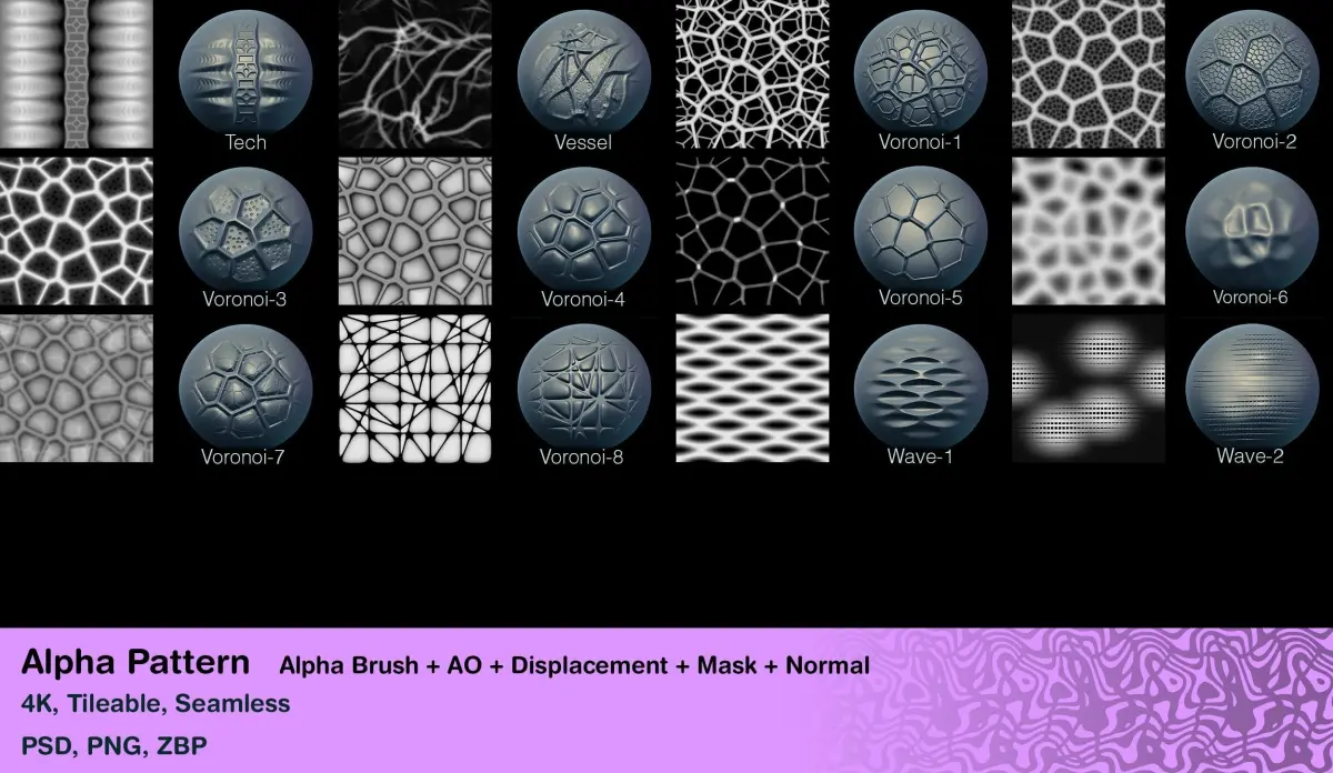 60 alpha patterns with 4K quality that you can use for Build alien characters, spaces and sci-fi equipment