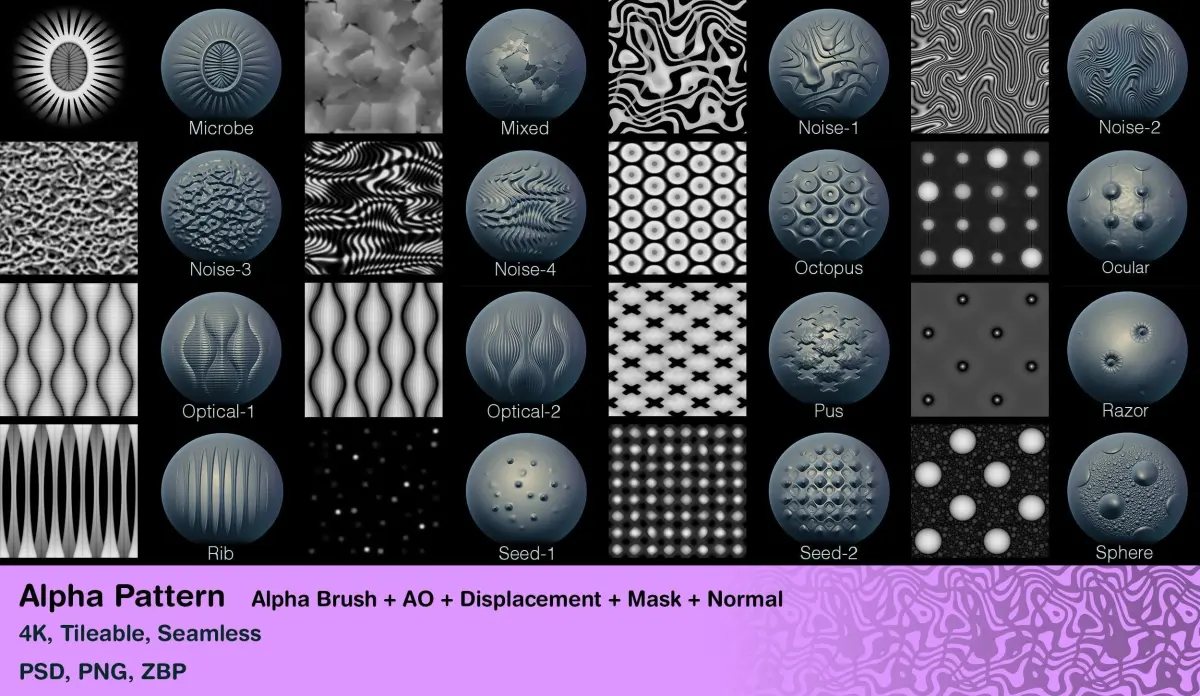 • Contains files: AO maps, Displacement, Mask, Normal, Alpha, Brush