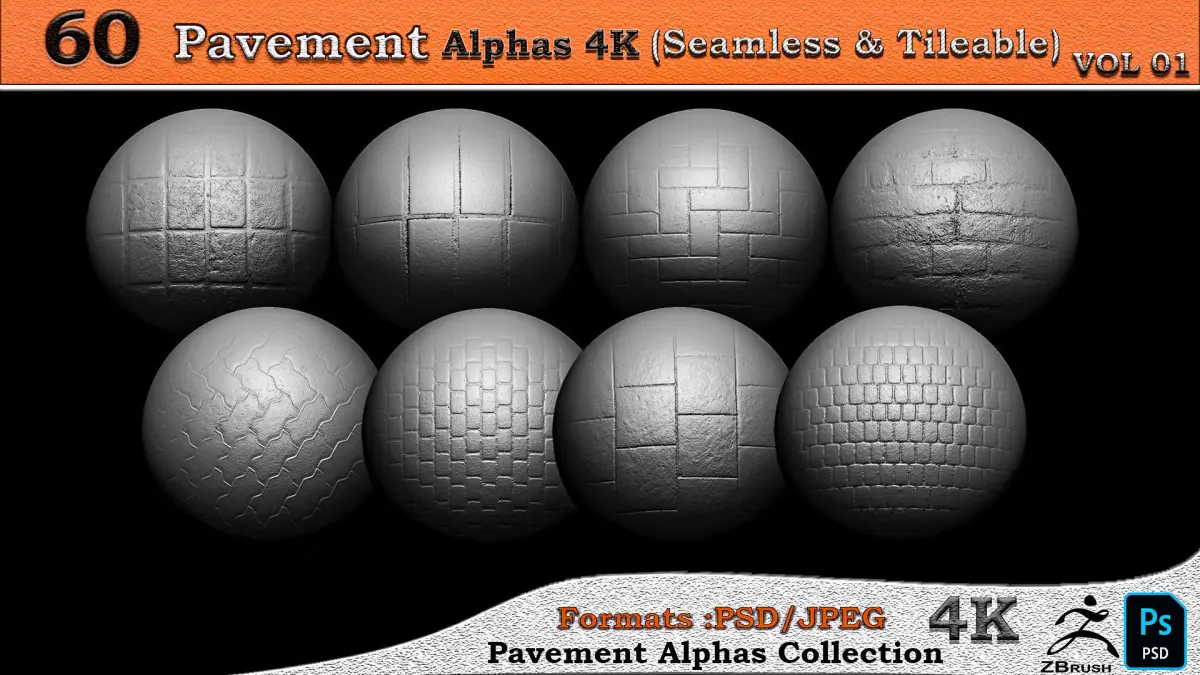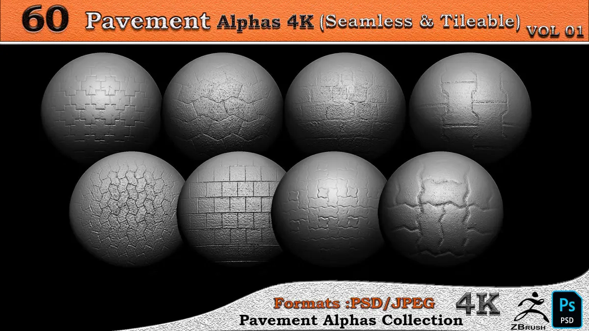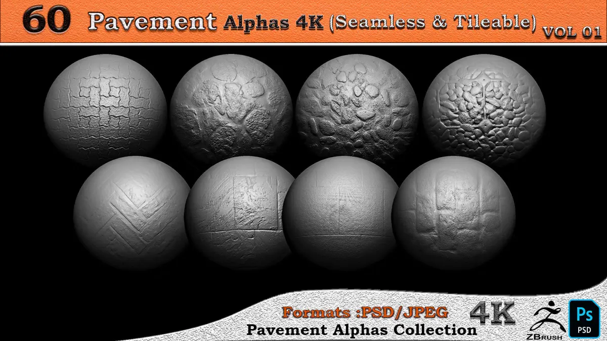 This pack includes 60 Alpha pavement Seamless & Tileable 4K. ( You can see all of them in the image gallery