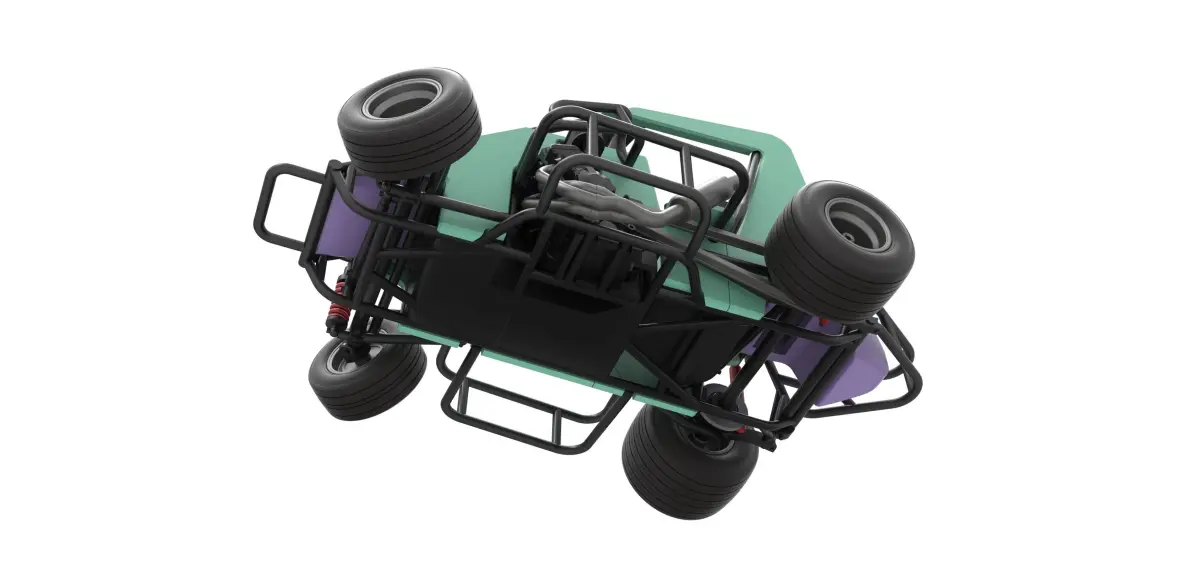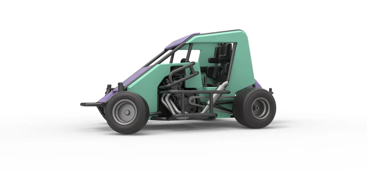 The model consists of parts: Air filter, Body, Engine, Exhaust pipes, Front rims, Front tires, Hood, Left bumper 1,2, Main gear, Radiator, Rear left rim, Rear left tire, Rear right rim, Rear right tire, Right bumper, Rim covers, Seat part 1,2, Shell left part 1-3, Shell right part 1,2, Shifter, Spacer, Steering wheel, Tank, Visor.