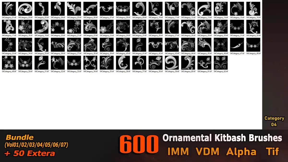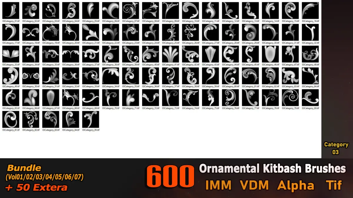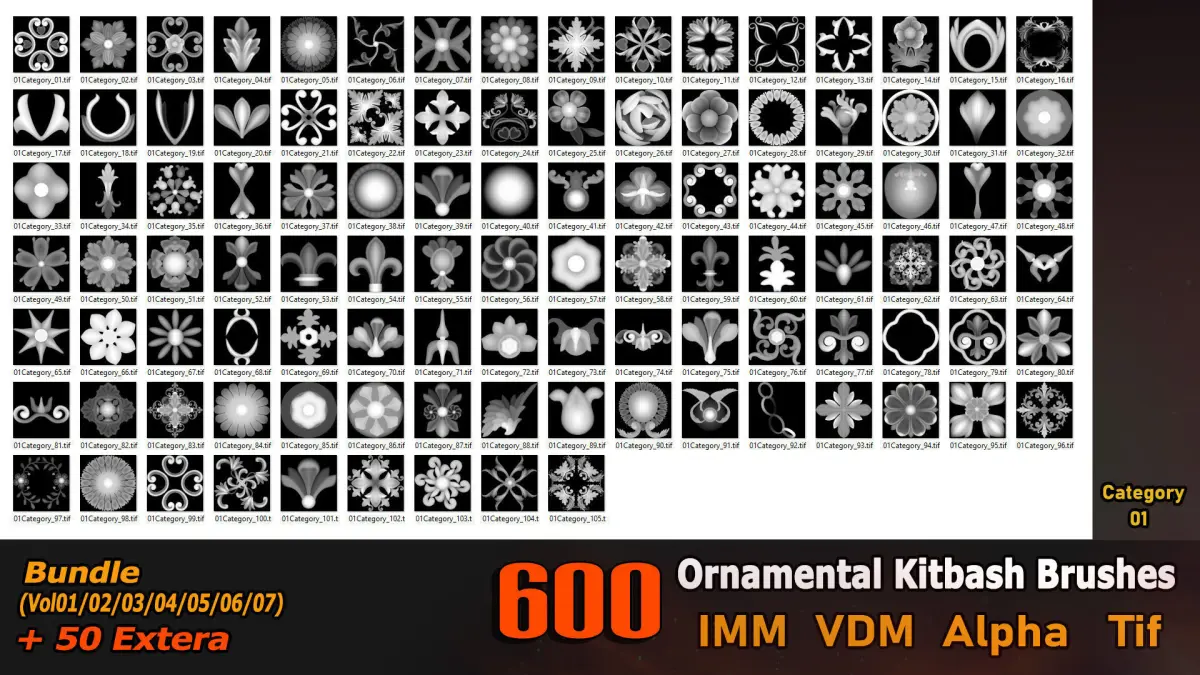 This product contains 600 ornamental Kitbash brushes with high quality and details (7 different categories) and can be used in all software.
