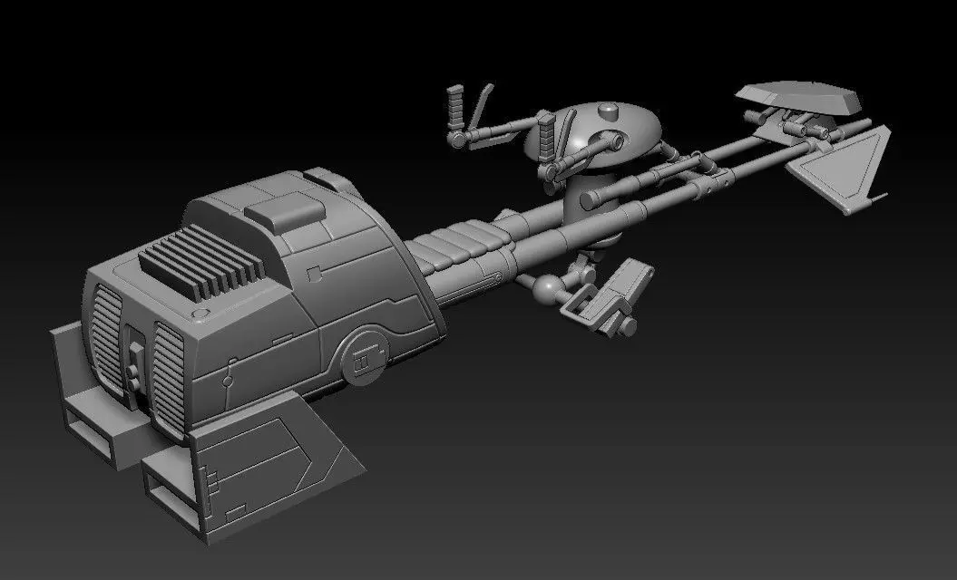 The speederbike was sculpted in Zbrush and a multiple-part assembly for easy 3d printing. Scale to fit 1:12 scale (6") figures for custom display.The speeder is able to stay flat on plan as the foot padles and back engine on same level for display.