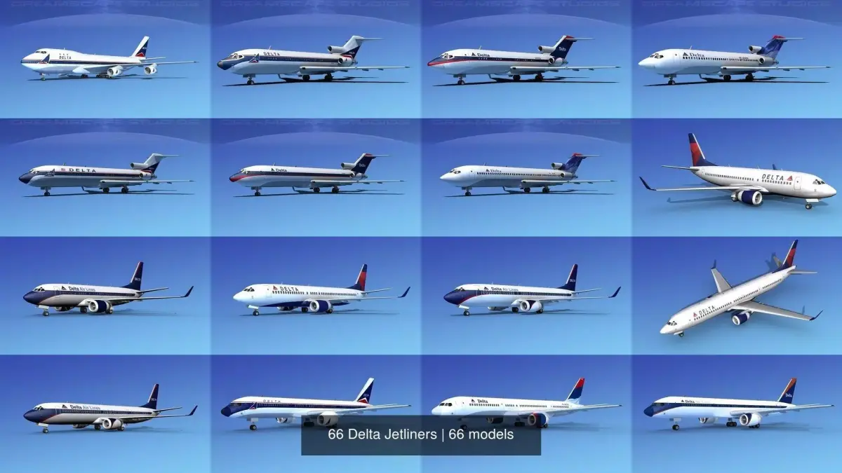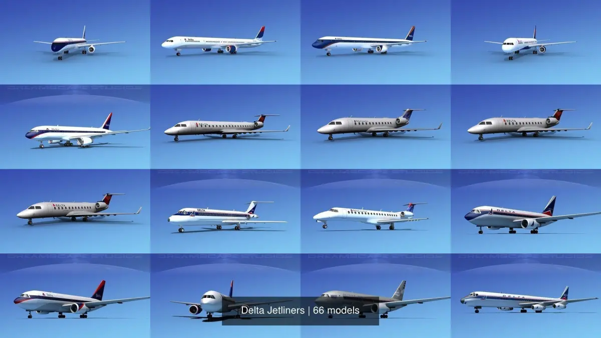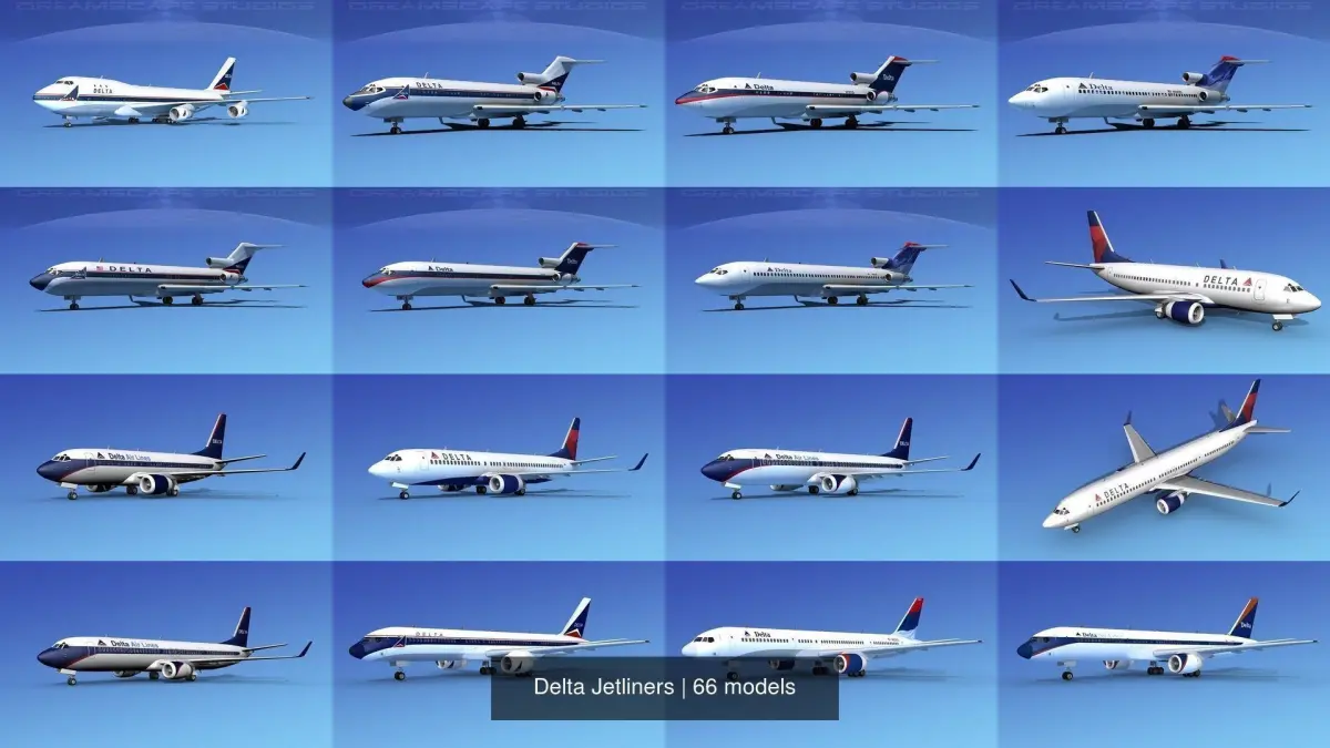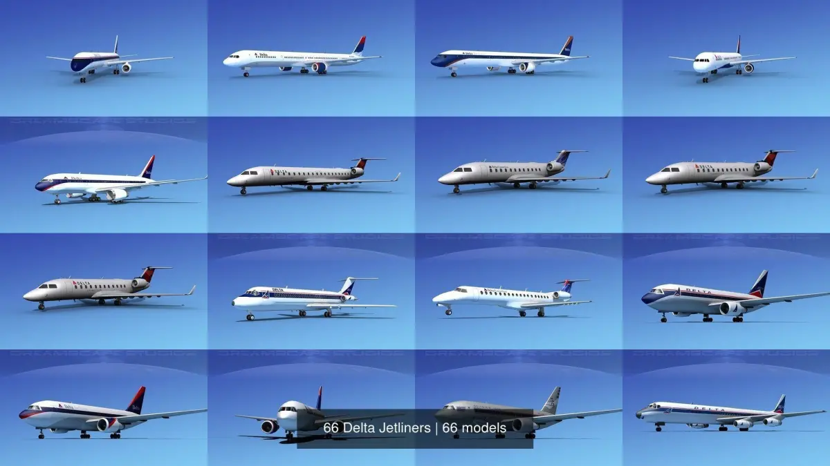 The large collection of 66 jetliners all flown by Delta Airlines. These models are built near to scale within a 3-5 percent ratio of actual general arrangement dimensions. These models are originally built in 3DStudioMax and rendered in standard scanline. Jets have retractable landing gear, animateable ailerons, flaps, rudder, elevators, stabilizer, landing gear doors and turbines. Models have basic rigging and are ready for animation work. Models are developed for video animation for populating airport scenes and in flight video. All textures and materials are included here in a MATEX files with each model. Models are exported to a wide variety of formats. Exported formats (3ds, lwo and obj) are prepared well to work correctly with every standard modeling software. Compatibility level with other software’s may be limited. Models are textured with multiple large HD maps and provide a good realistic rendering when lighted and animated properly. P.S. Not designed for 3d printing, digital files only.
