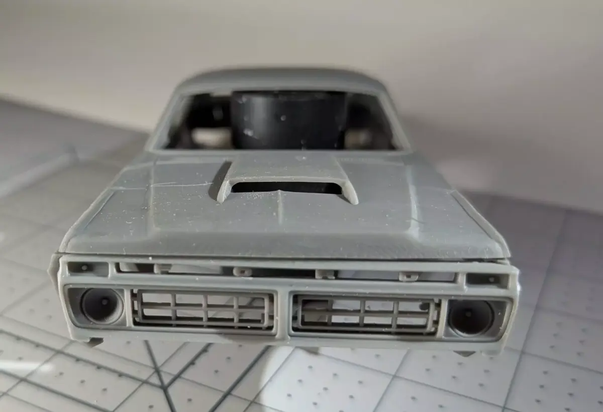 What you get: body, grill, bumper, valance, signal lens, a motor‑ready chassis, plus four hood choices (stock, scoop, Cobra script, or Galaxie script).