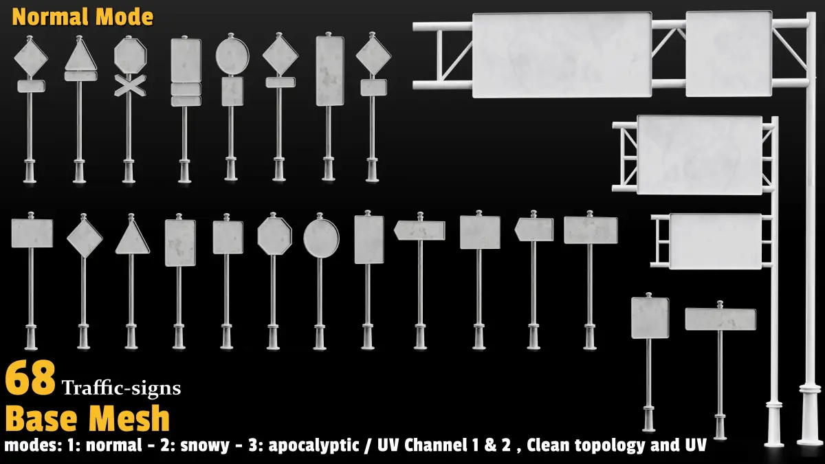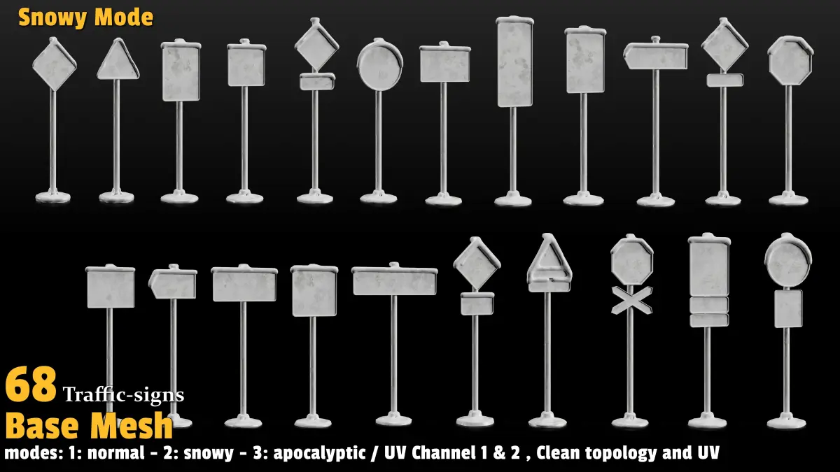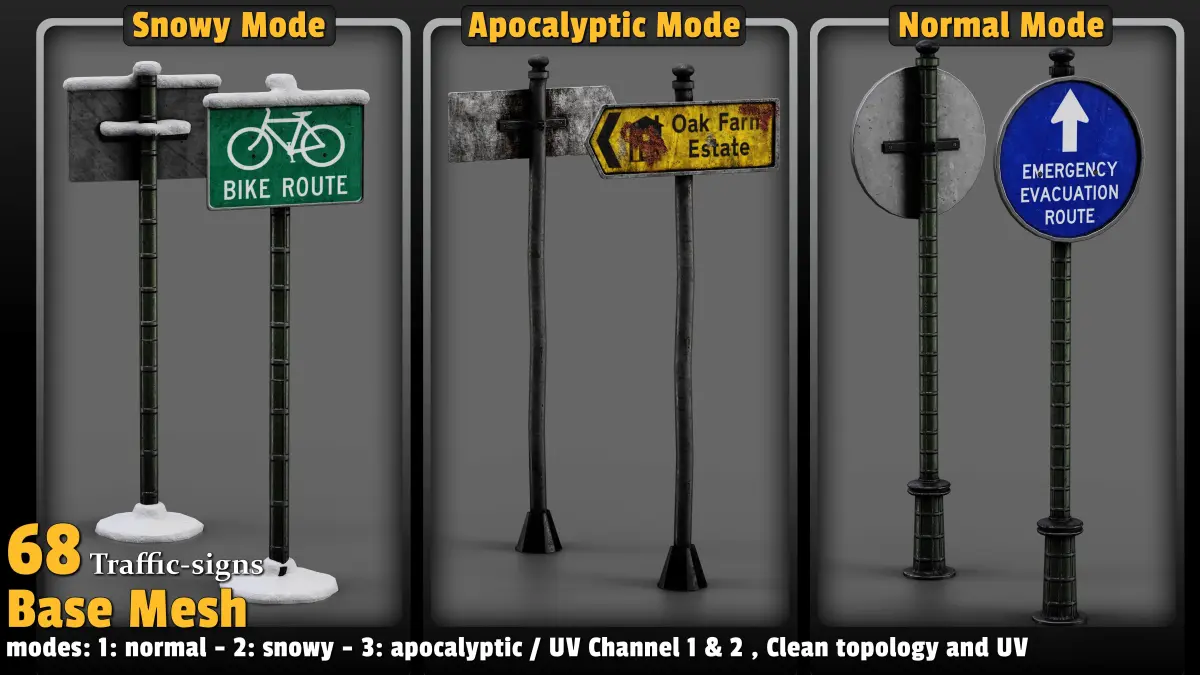 3 modes (Normal, Snowy, Apocalyptic)Clean topology and UVs (UV Channels 1 & 2)Fully customizable and texture-readySuitable for games,and film environmentsCompatible with any software: The models can be easily used in any 3D software.This pack allows you to optimize your game environment creation process effortlessly. Save valuable time and move your work forward faster by using these pre-made base meshes instead of modeling from scratch.Flexibility in Use: You can easily apply any road sign label to the models, as all the model forms have been crafted with real-world accuracy.