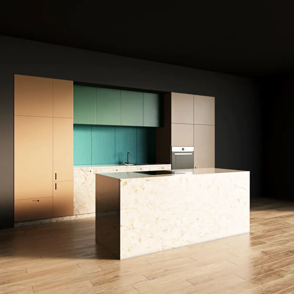 Only the kitchen and the island are present in the scene. The floor, walls, ceiling are yours.