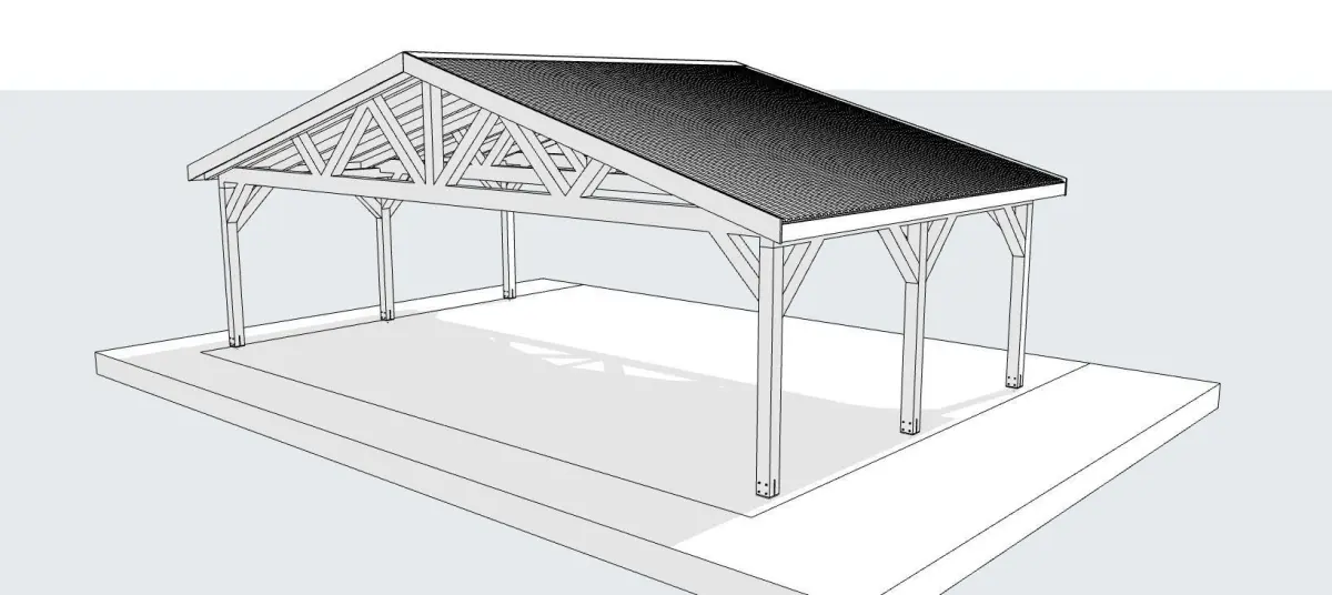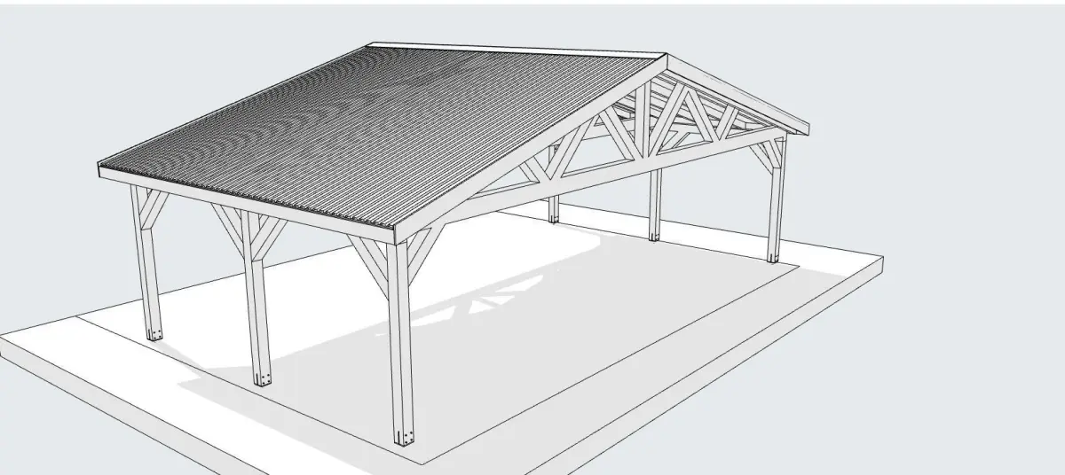 Shed model with dimensions of 6x9m along the width of the columns, columns with a cross-section of 14x14cm, horizontal beams are designed in the same way. The whole thing is covered with full boarding and sheet metal. The poles stand on their feet, not directly on the ground.