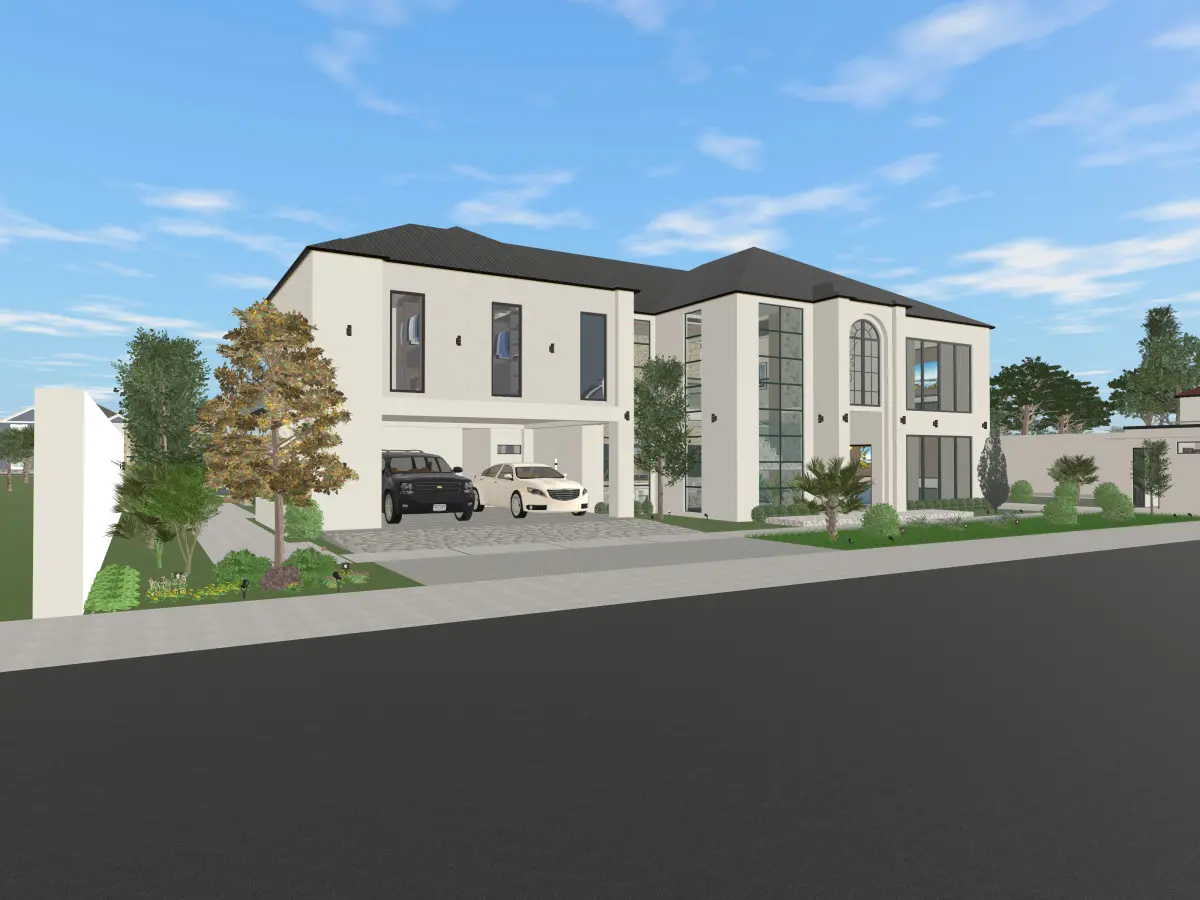 1.) Modern Minimalist with Traditional Influences:The house exhibits a modern minimalist aesthetic with its clean lines, flat surfaces, and geometric shapes.However, it also incorporates traditional elements like the arched window and the overall symmetrical facade.