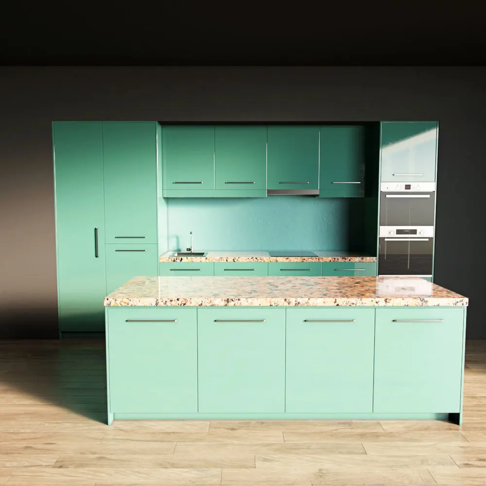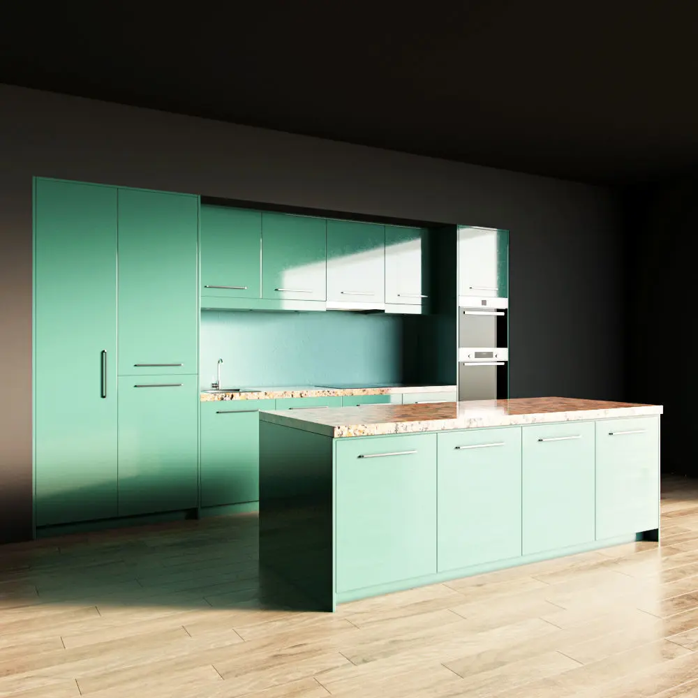 Only the kitchen and the island are present in the scene. The floor, walls, ceiling are yours.